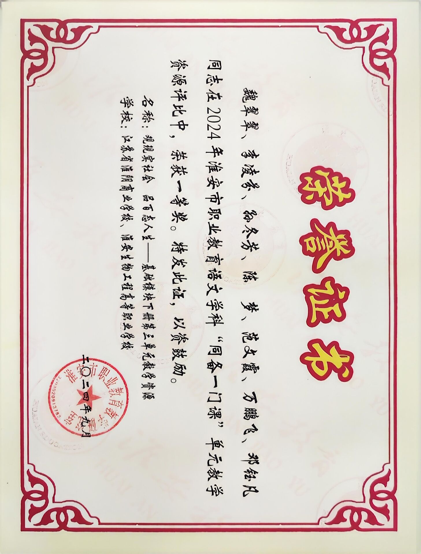 魏翠翠老师获2024年淮安市职业教育语文学科“同备一门课”单元教学资源评比一等奖