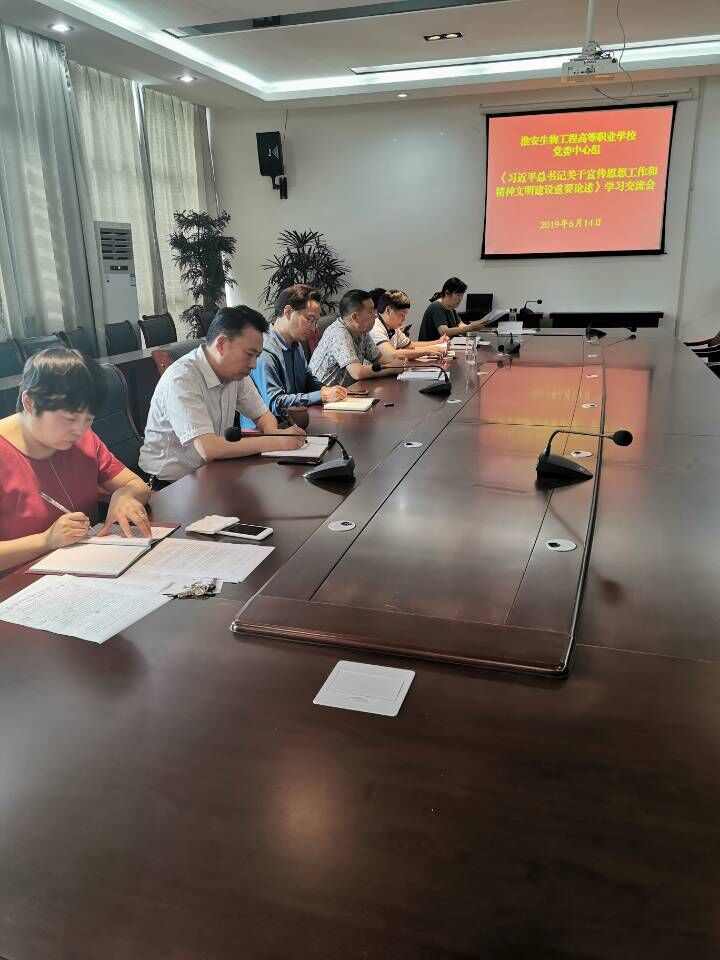 6月14日下午,淮安生物工程高等职业学校党委中心组(扩大)在实训楼119会议室召开《习近平总书记关于宣传思想工作和精神文明建设重要论述》专题学习会。校领导班子全体成员、办公室党支部和学工处党支部部分党员代表参加了学习会。