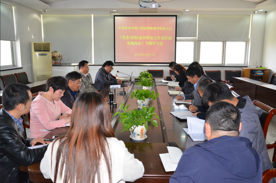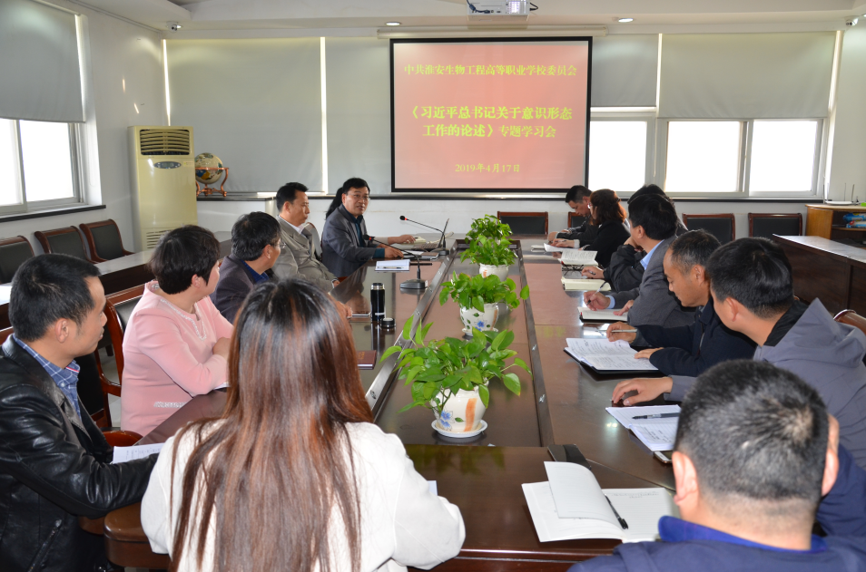 4月17日下午,中共淮安生物工程高等职业学校委员会在行政楼三楼会议室,召开《习近平总书记关于意识形态工作的论述》和《党委(党组)意识形态责任制实施办法》专题学习会。校领导班子成和各支部党员代表参加了学习会。