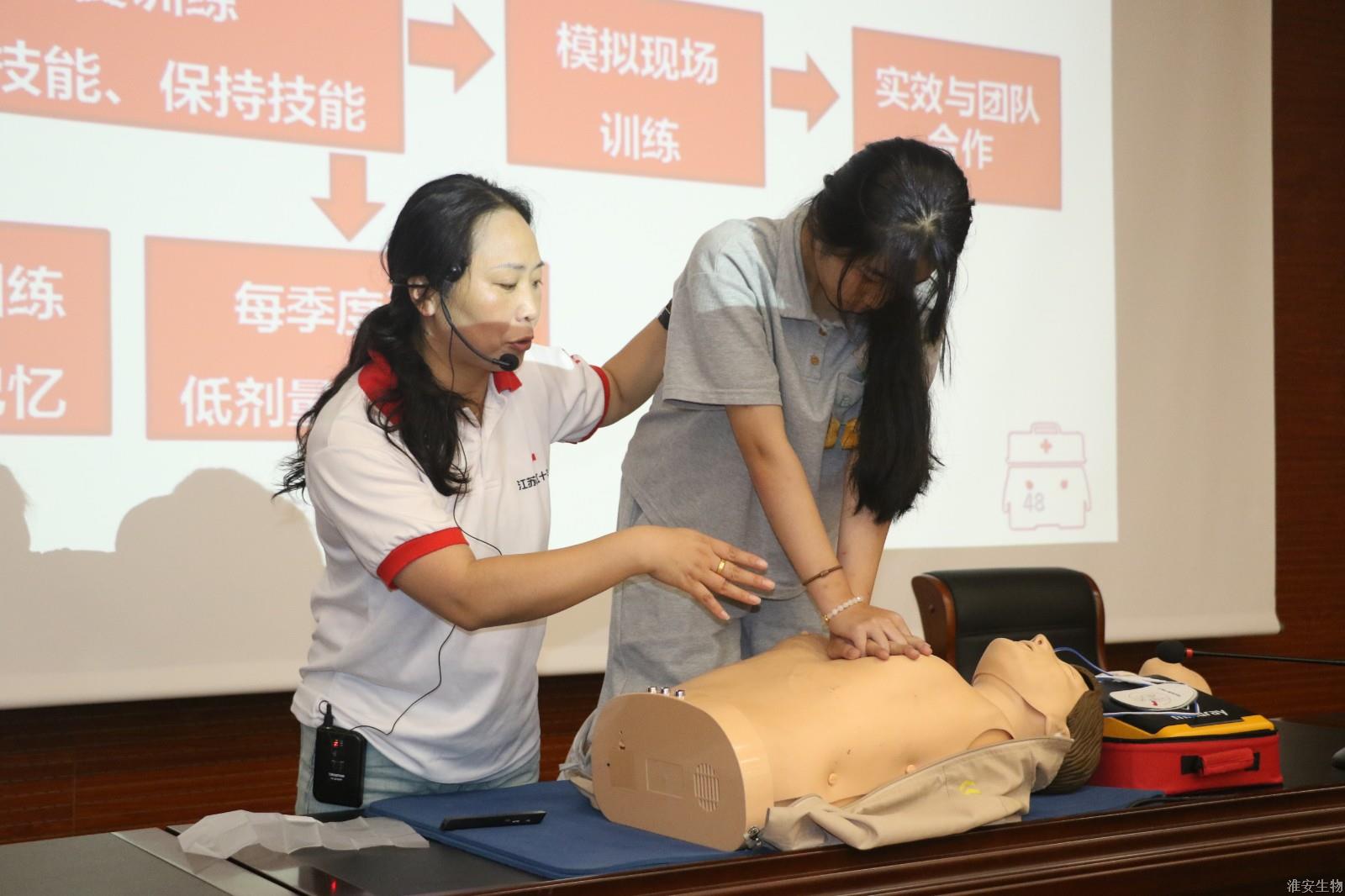 培训现场,淮安区红十字会周傑主任带领潘志娟、金梦圆、金亚珍等四位应急救护讲师,通过生动的案例讲解、模拟演练与互动问答等方式,对健康防护理论与技能、医疗包扎、AED体外除颤器使用方法、心肺复苏“黄金4分钟”、海姆立克急救法“生命拥抱”等方面进行了系统的培训与教学,同学们聚精会神,认真倾听,每一个技能都深深烙印在了同学们的心田。