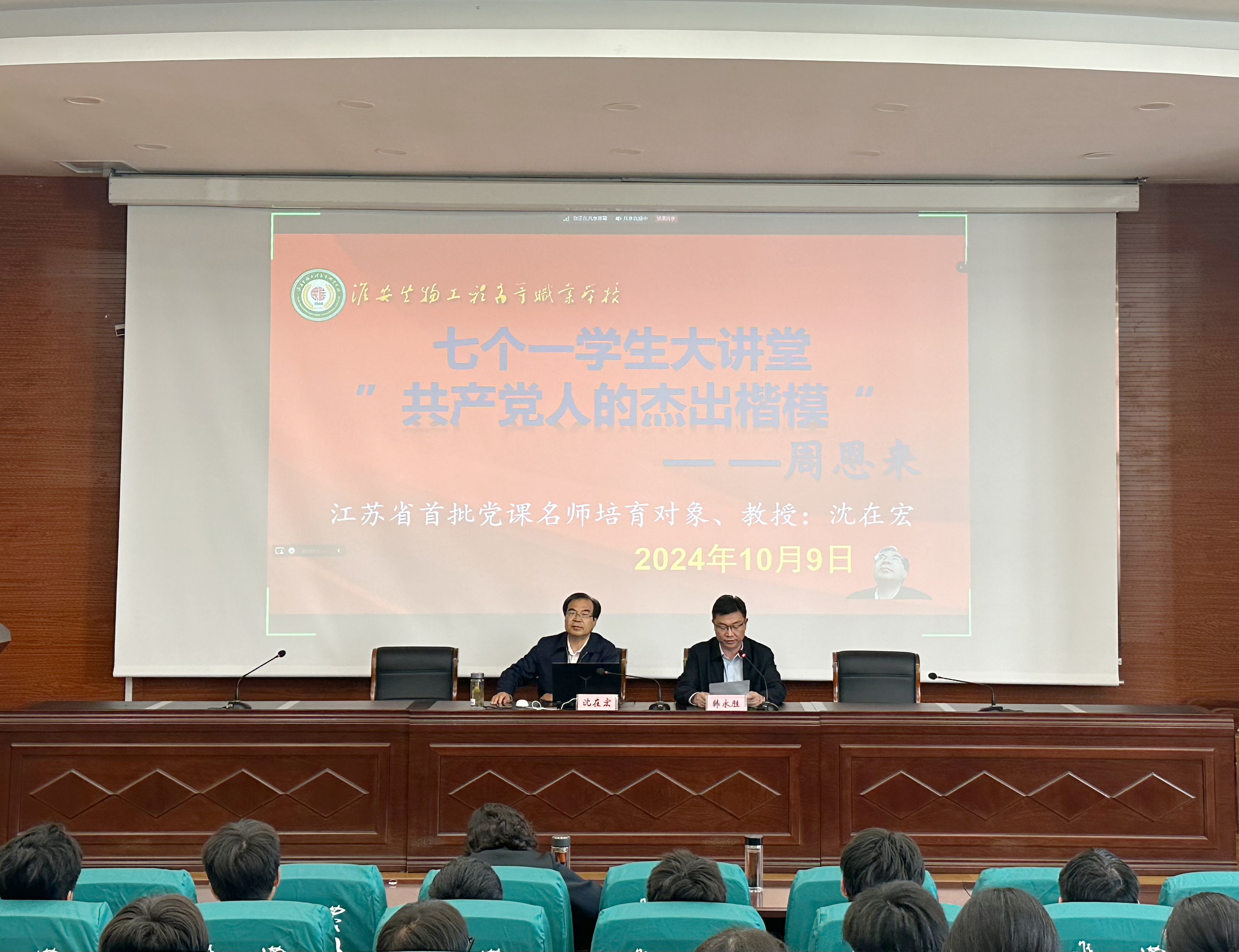 10月9日下午,淮安生物工程学校举办学生大讲堂,特邀市民政局二级巡视员、沈在宏书记,以《共产党人的杰出楷模—周恩来》为题,在行政楼报告厅为全体在校学生开设专题讲座。讲座由校党委书记韩永胜主持,副校长禹立馨参加专题讲座。