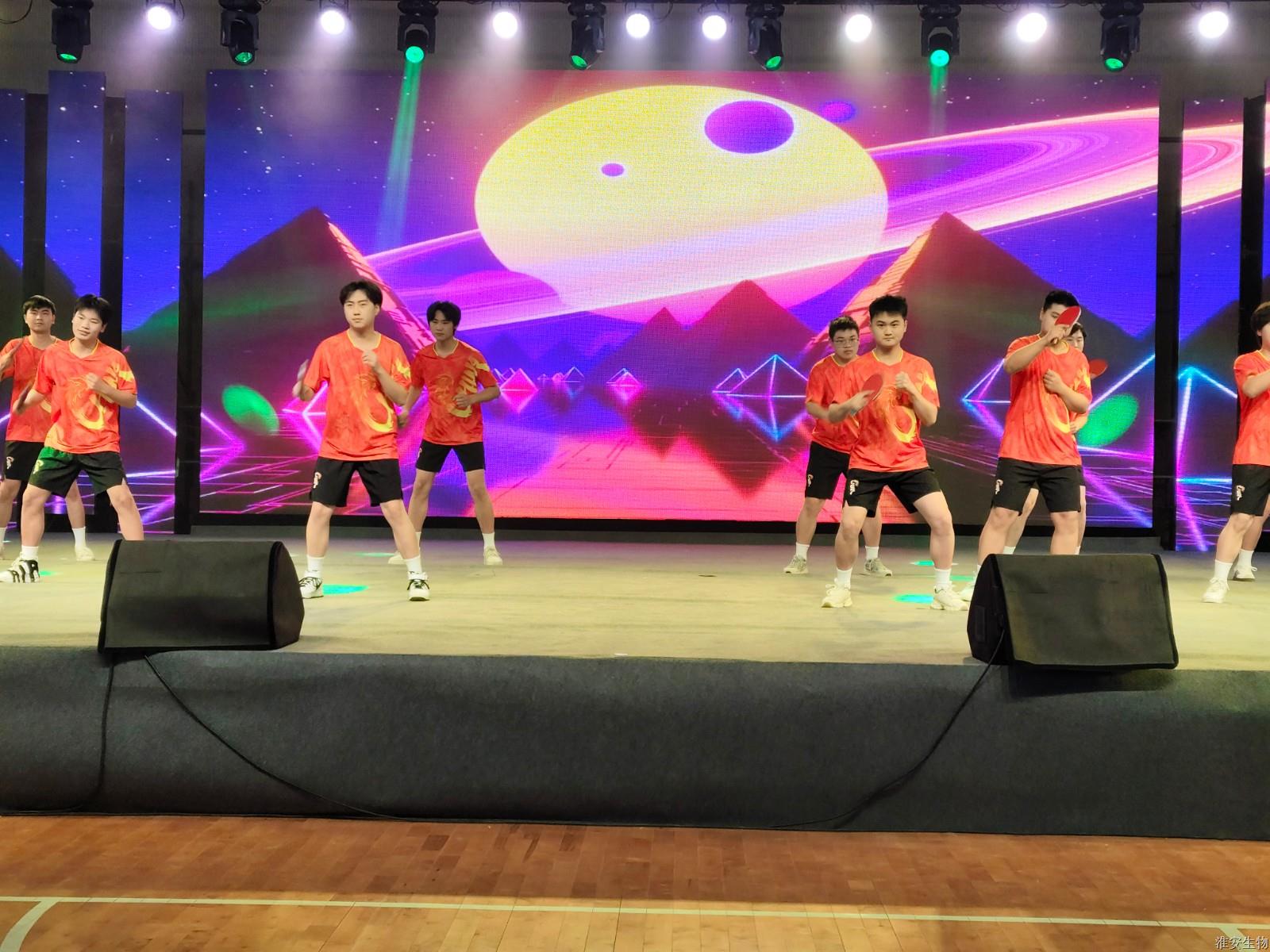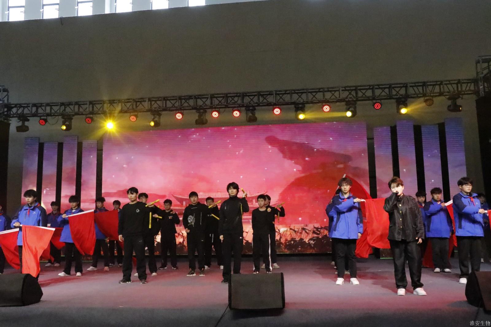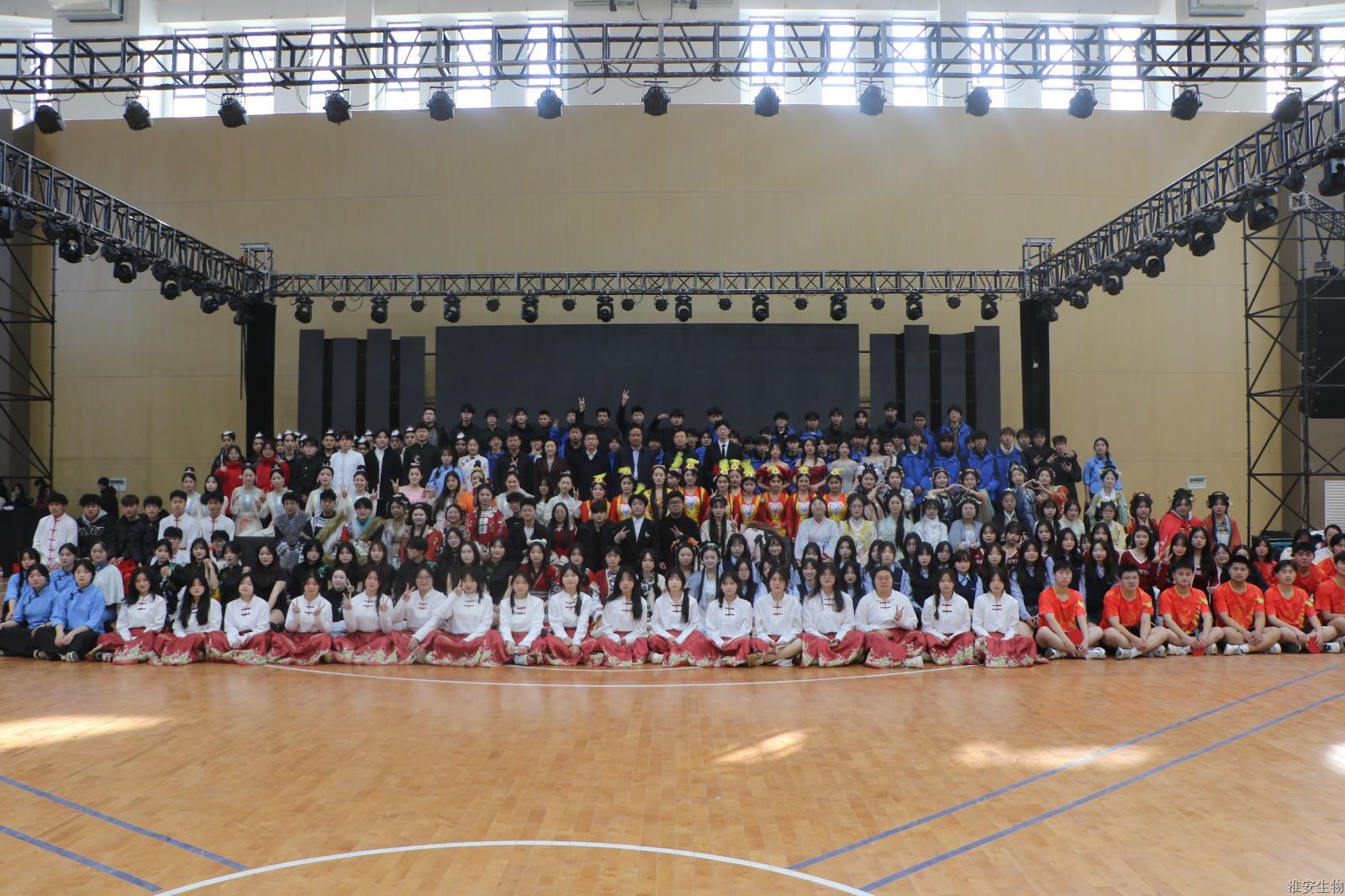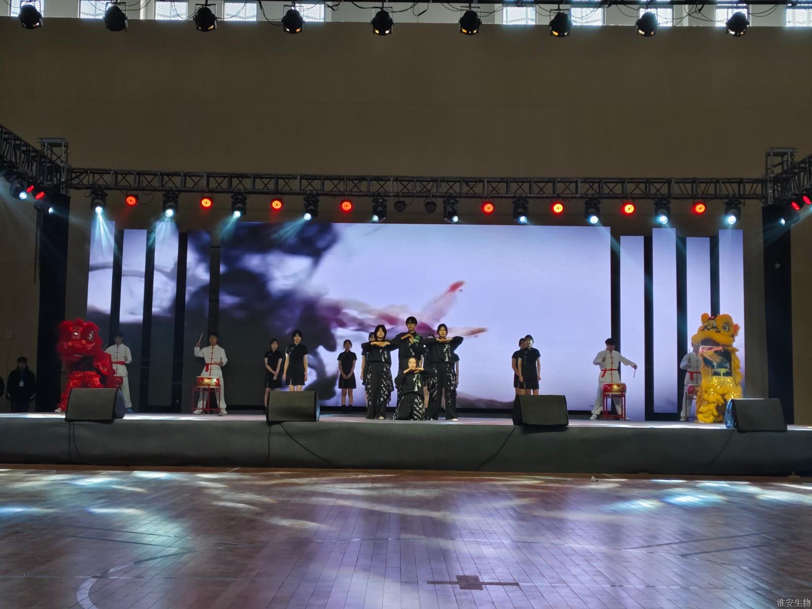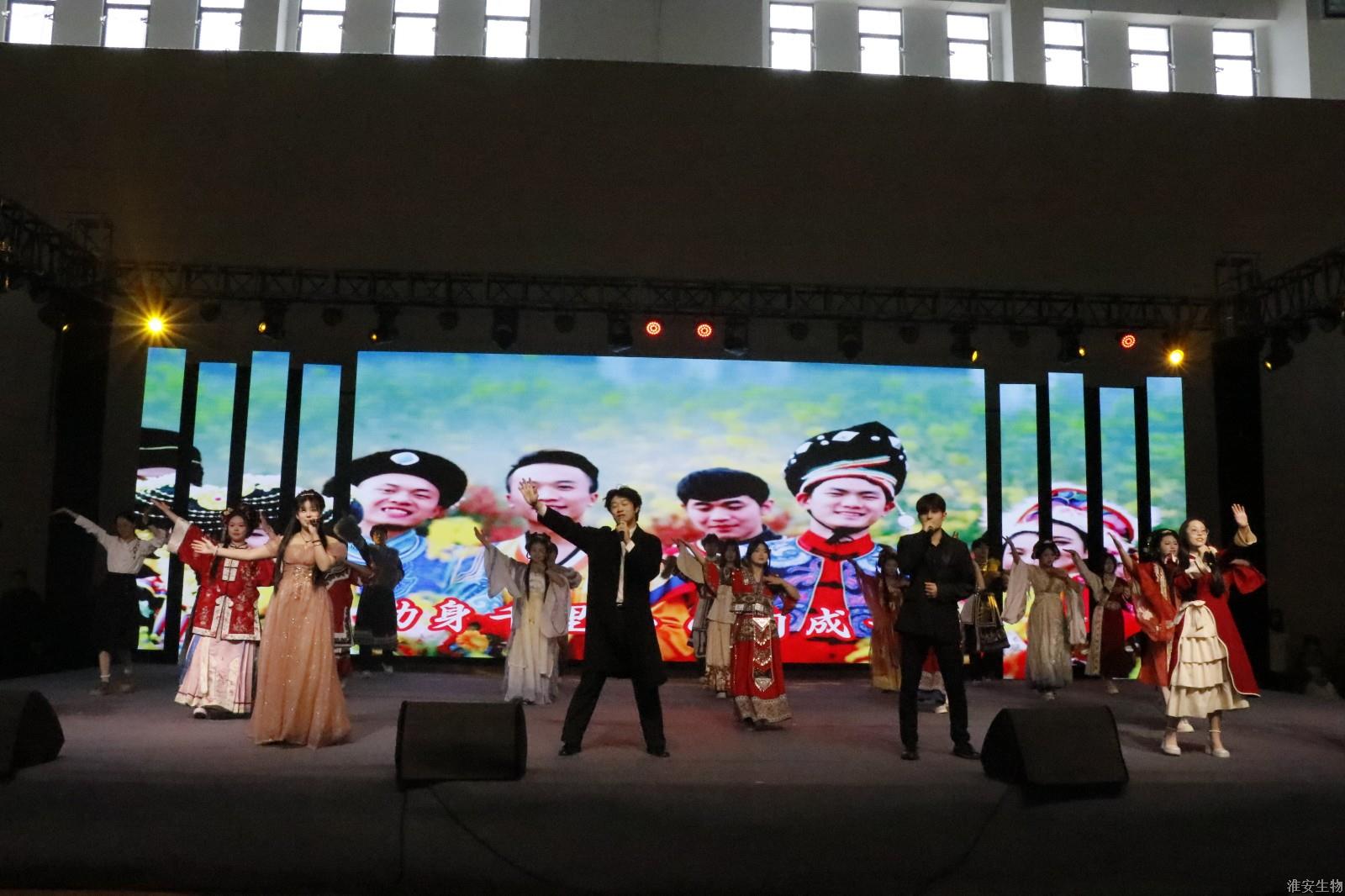 “从兰亭曲水到烽火狼山,文明的密码在血脉中永恒。”《兰亭序》、《旗舞中华》、《四季风华》、《湖心丽影》等节目将诗词、武术、戏曲等传统元素注入现代表达,让观众仿佛置身历史长河。“秋瑾的呐喊穿越时空,红船的光影照亮前路。”诗朗诵《秋瑾》以沉浸式体验叩击心灵,激荡灵魂。《光影红船路》以光和影的明暗变幻,为我们呈现一幅幅难忘的复兴之路。话剧《火种·农魂》取材校史,红色基因与校史记忆的交织,让革命精神具象为可感可知的精神图腾。机高2101等班级带来的球类操《青春律动》将篮球操、乒乓球操、羽毛球操和跆拳道、双截棍展示融为一体,展现了淮农学子的青春活力与激情。红石榴歌舞团带来的《丝路花语》以古老的丝绸之路为背景,融合了新疆独特的民族风情与绚烂的文化色彩。舞者们身着华丽的民族服饰,翩翩起舞,如同丝路上绽放的朵朵鲜花,传递着民族团结与和谐共处的美好愿景。当敦煌飞天的飘带遇上《APT》啦啦操的活力节拍,当《巾舞英雄》的传统舞狮与街舞韵律碰撞,多元艺术形态的交融,诠释"各美其美,美美与共"的融合智慧。