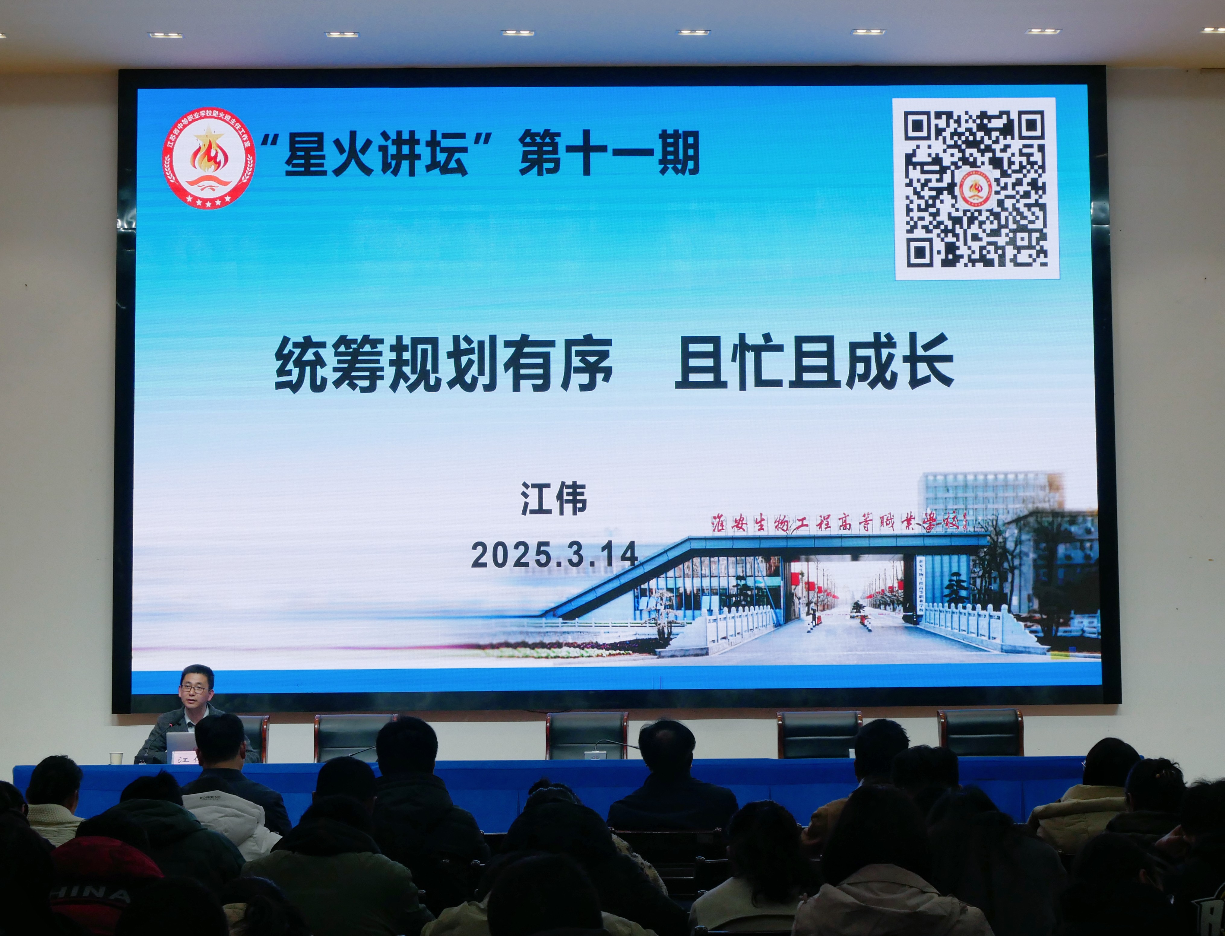 办公室副主任江伟以“统筹规划有序,且忙且成长”为主题,结合自身工作经历和生动案例,从常规管理、班主任比赛、专业成长三个角度,为年轻教师带来了一场精彩的经验分享。他强调年轻教师要树立终身学习的理念,不断更新教育观念,提升专业素养,在比赛中提升能力,在忙碌中实现高效成长。