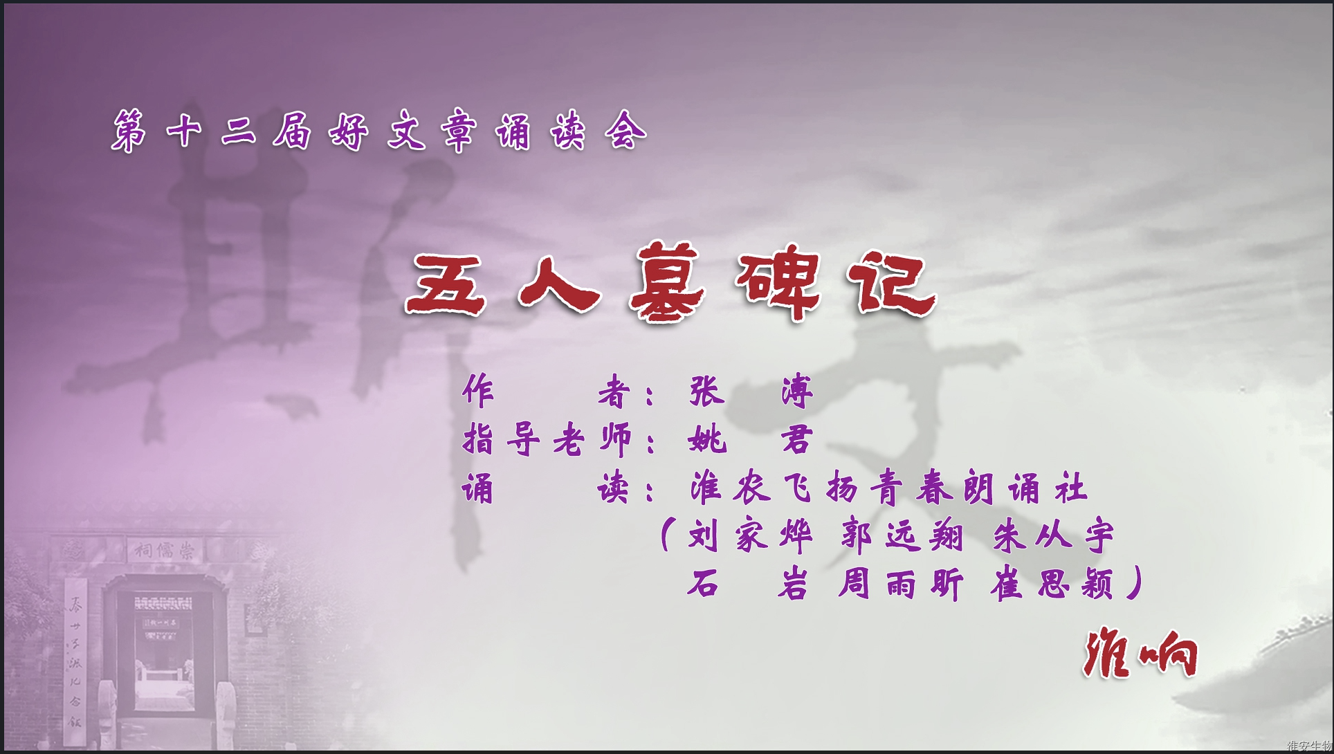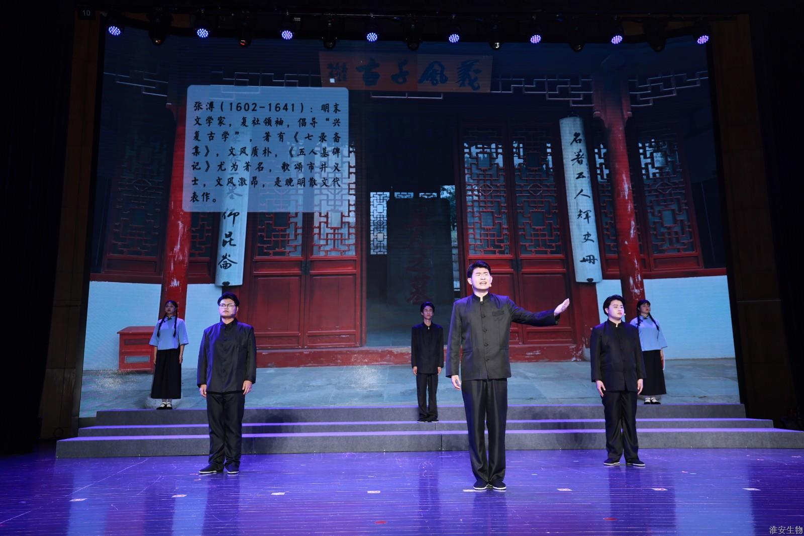 第二章聚焦“为生民立命”,其中的《五人墓碑记》一文由淮农飞扬青春朗诵社刘家烨、郭远翔、朱从宇、石岩、周雨昕、崔思颖倾情演绎。六位同学经过三个多月的刻苦排练,对作品的所蕴含的精神意蕴有了比较深刻和全面的理解,舞台上的精彩呈现赢得现场观众的阵阵掌声。演出现场,淮农飞扬青春朗诵社的王楠同学接受了淮安市电视台的采访,她的青春活力、表达得体获得了广泛好评。