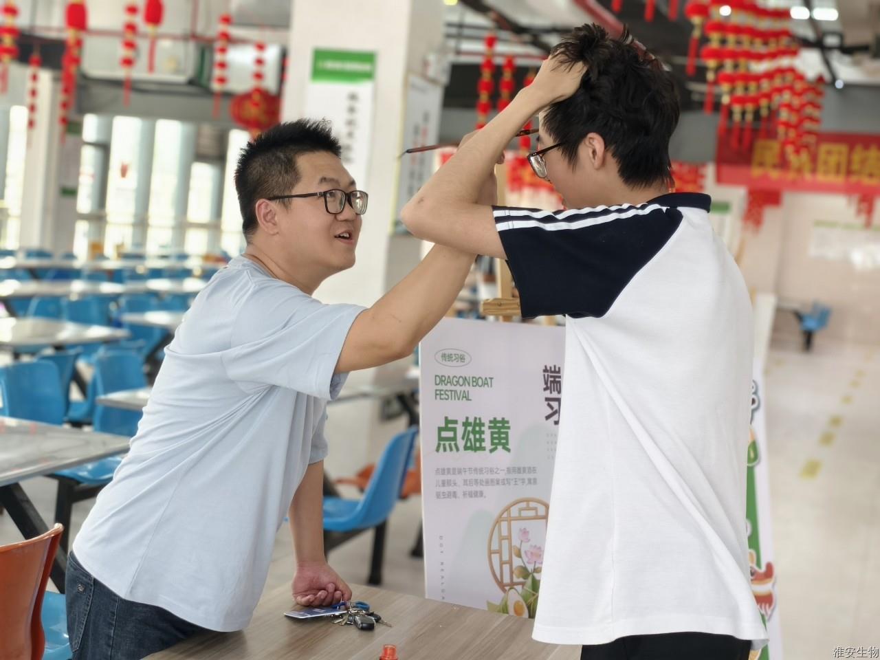 活动现场,传统与现代交织成欢乐的海洋。在"点雄黄"仪式区,张老师手持毛笔,蘸取金黄色的雄黄,轻轻点在学生们的眉心,勾勒出驱邪避灾的吉祥印记。古老的祈福仪式跨越时空,在他们心间种下传统文化的种子。