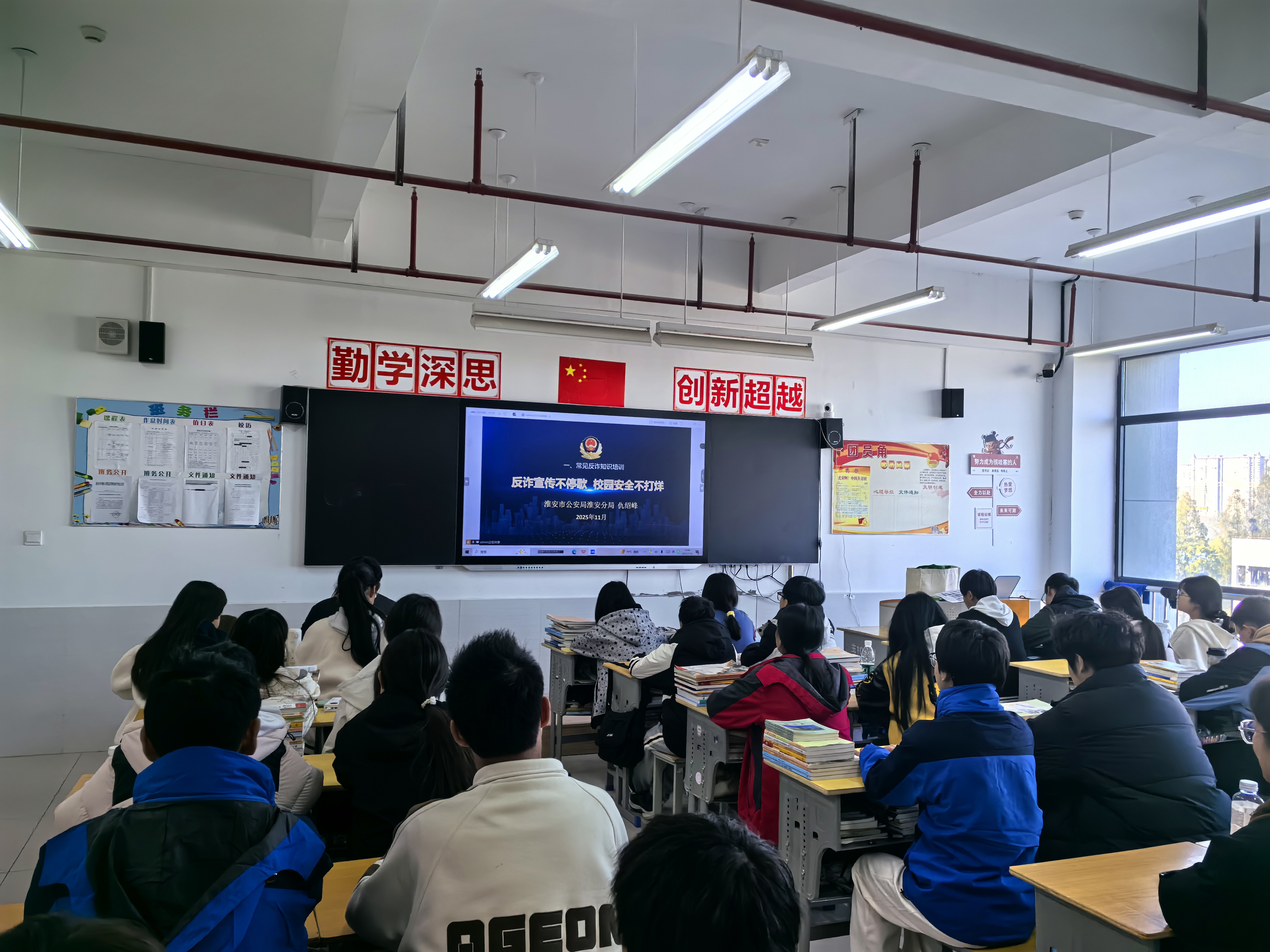 在校园安全建设持续推进的背景下,淮安生物工程学校“学生大讲堂”于2025年11月5日聚焦反诈、反恐、反霸凌主题,联合淮安市公安局淮安分局开展专题宣讲。活动由分局副局长、学校法治副校长仇绍峰主讲,淮安生物工程学校副校长邵春祥主持本次宣讲。活动采用“线上+线下”双模式——民族教育处学生代表在多功能报告厅现场参与,其余学生在教室同步收看,以“警校联动、师生同心”的合力,为全校学子筑牢安全防护网。