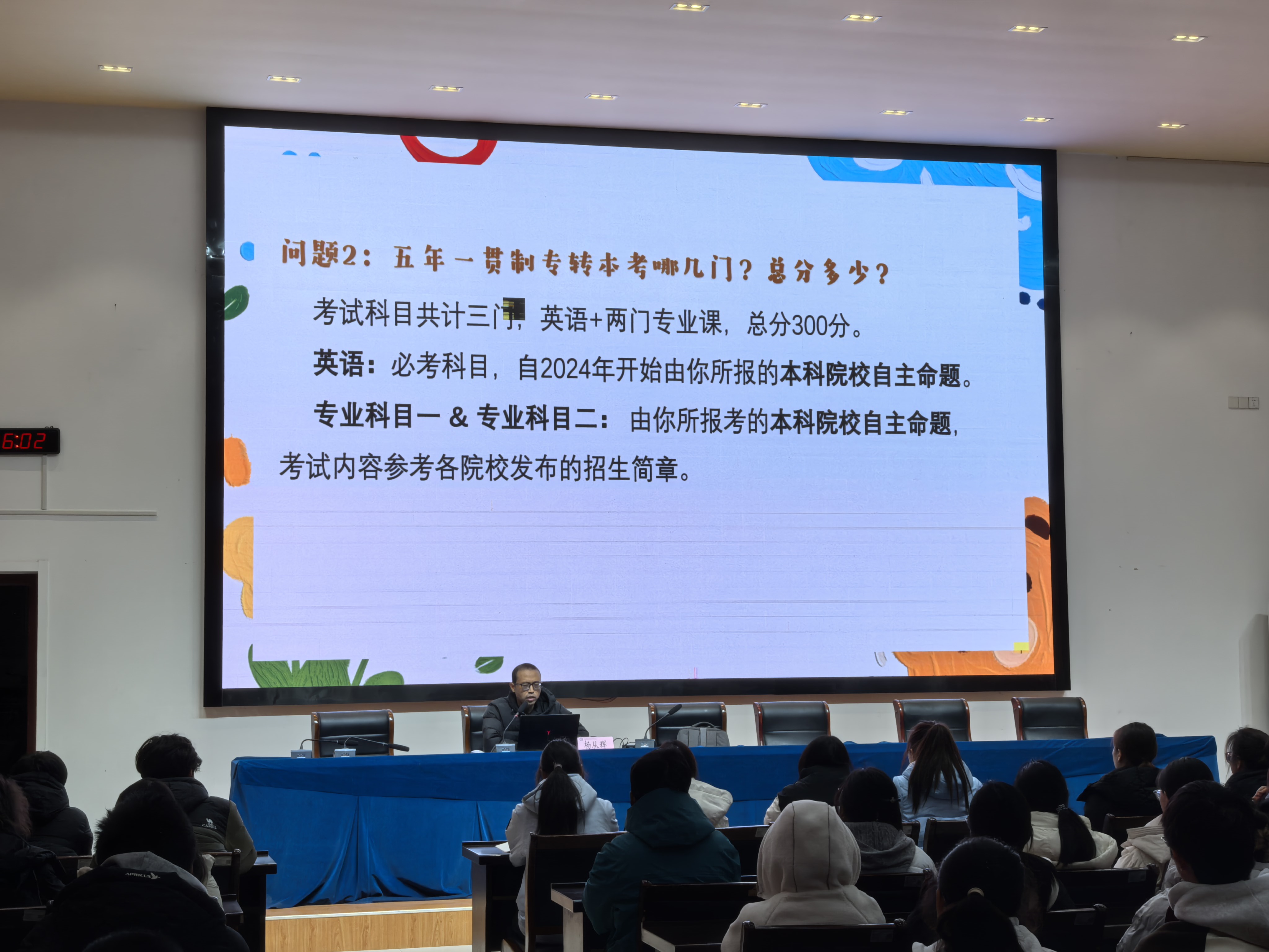 为帮助五年制高职学生明晰升学路径、科学规划备考策略、切实提升专转本考试竞争力,12月23日,我校在124会议室成功举办“五年制专转本备考专题培训讲座”。本次讲座由杨从辉老师主讲,招生就业处统筹组织,吸引了全校众多有志于升入本科院校的学子踊跃参与,现场座无虚席,学习氛围浓厚。