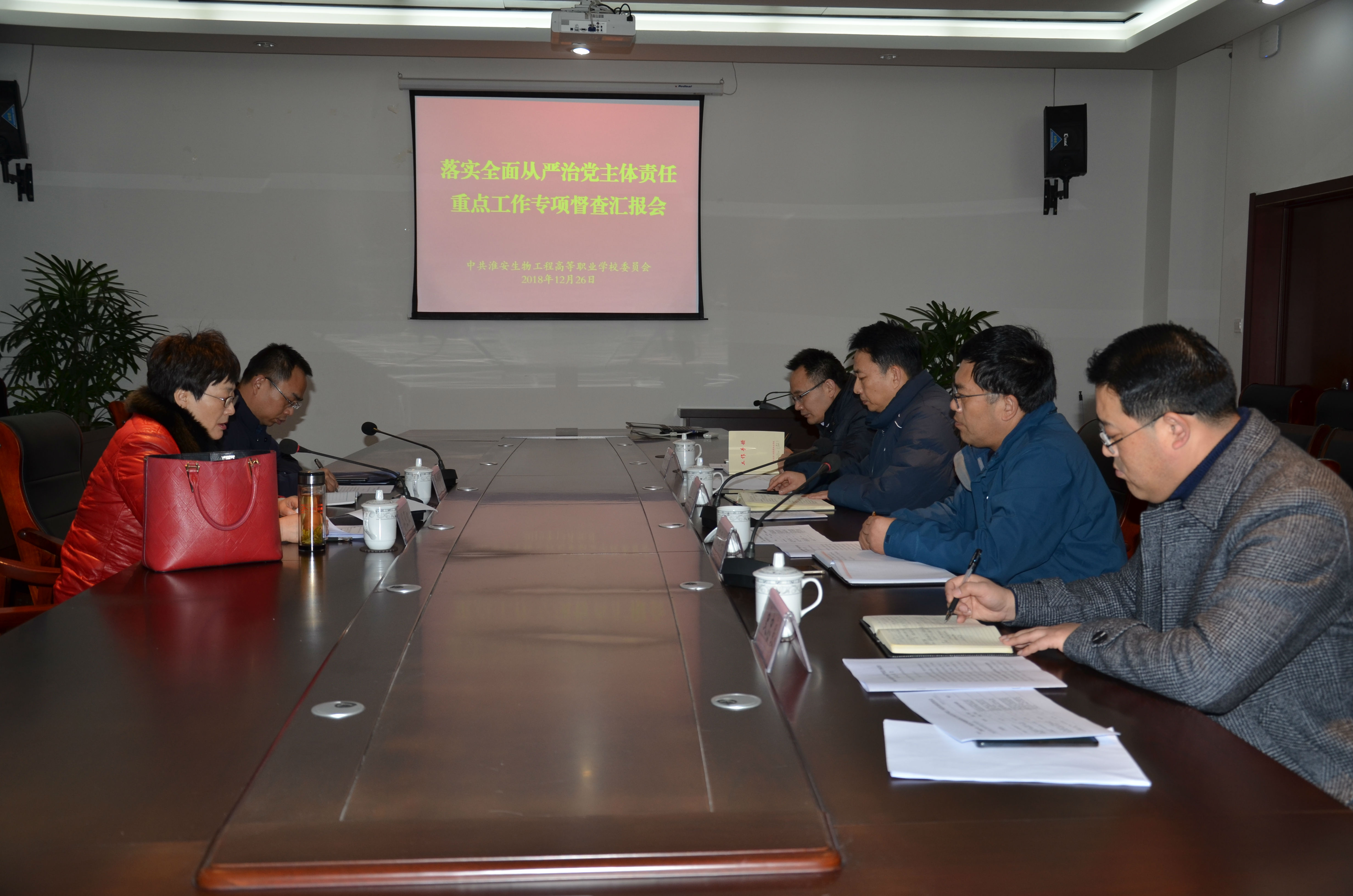 12月26日下午,按照《关于进一步开展落实全面从严治党主体责任专项督查的通知》(淮委教〔2018〕64号)文件精神,淮安市教育局副局长谷玉红来我校进行落实全面从严治党主体责任重点工作专项督查,办公室主任蒋留成陪同。我校纪委书记王坚、党委副书记石国安、办公室主任刘江、纪委副书记史忠良出席会议。谷玉红主持会议。 会上,谷玉红宣读了督查内容。随后,石国安从六个方面汇报了我校2018年度落实主体责任情况,王坚作补充说明。谷玉红认为我校全面从严治党主体责任落实情况举措务实、成效明显,给予肯定。