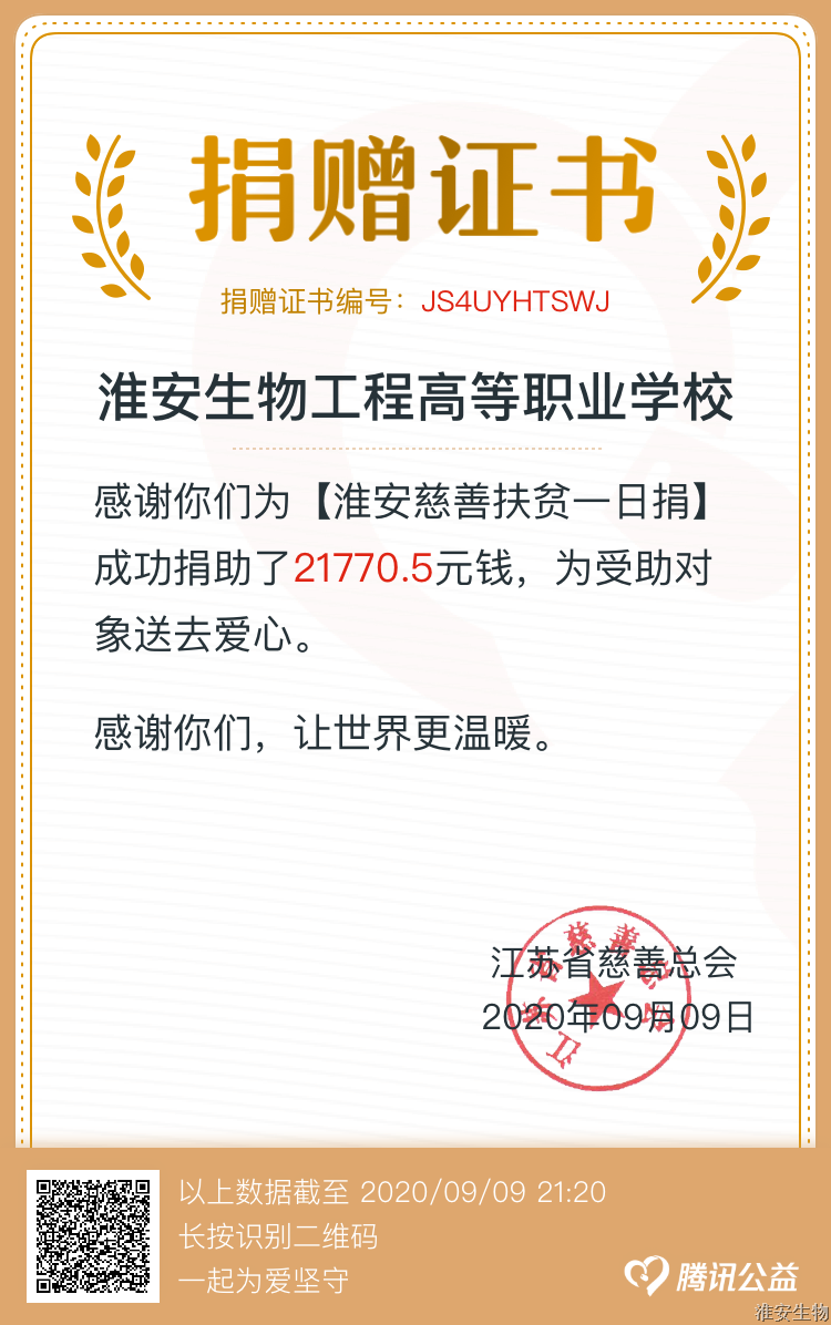 为进一步弘扬慈善文化,发展慈善事业,增强师生员工的慈善意识,营造团结、友爱、文明、和谐的校园氛围,校工会在“99公益日”活动期间,组织开展 “慈善一日捐”活动。募集善款总额在淮安市各大单位线上筹款总额中名列第二。