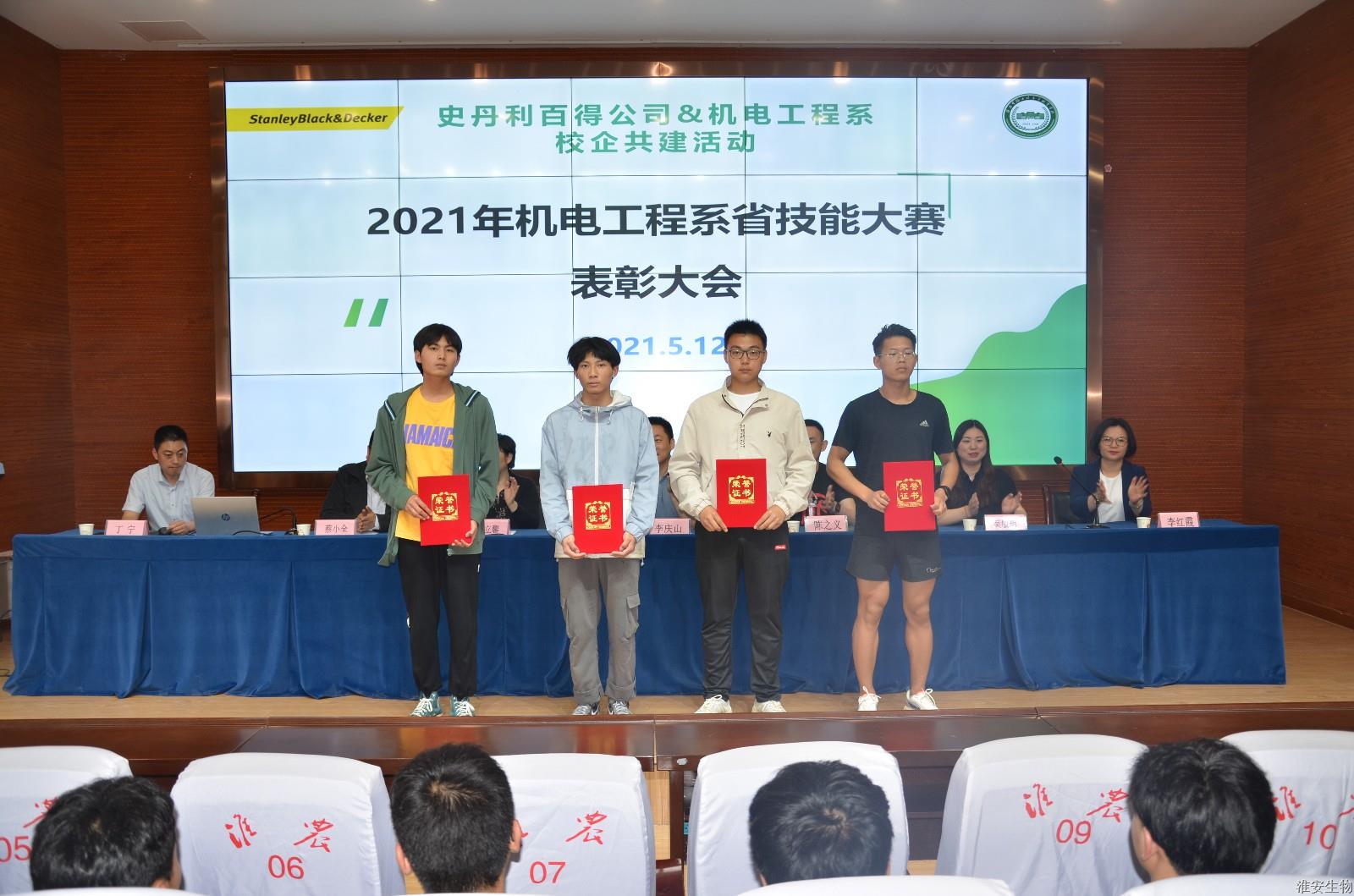 2021年5月12日,淮安生物工程学校机电工程系与史丹利百得(苏州)公司开展校企共建活动,公司为在2021年江苏省技能大赛中获奖的机电工程系师生进行了奖励。史丹利百得(苏州)公司人事部经理李庆山、人事主管吴敏玥、行政主管李红霞、招聘主管陈之义和淮安生物工程学校副校长禹立馨、校企合作处负责人蔡小全、机电工程系负责人丁宁共同出席了本次活动。