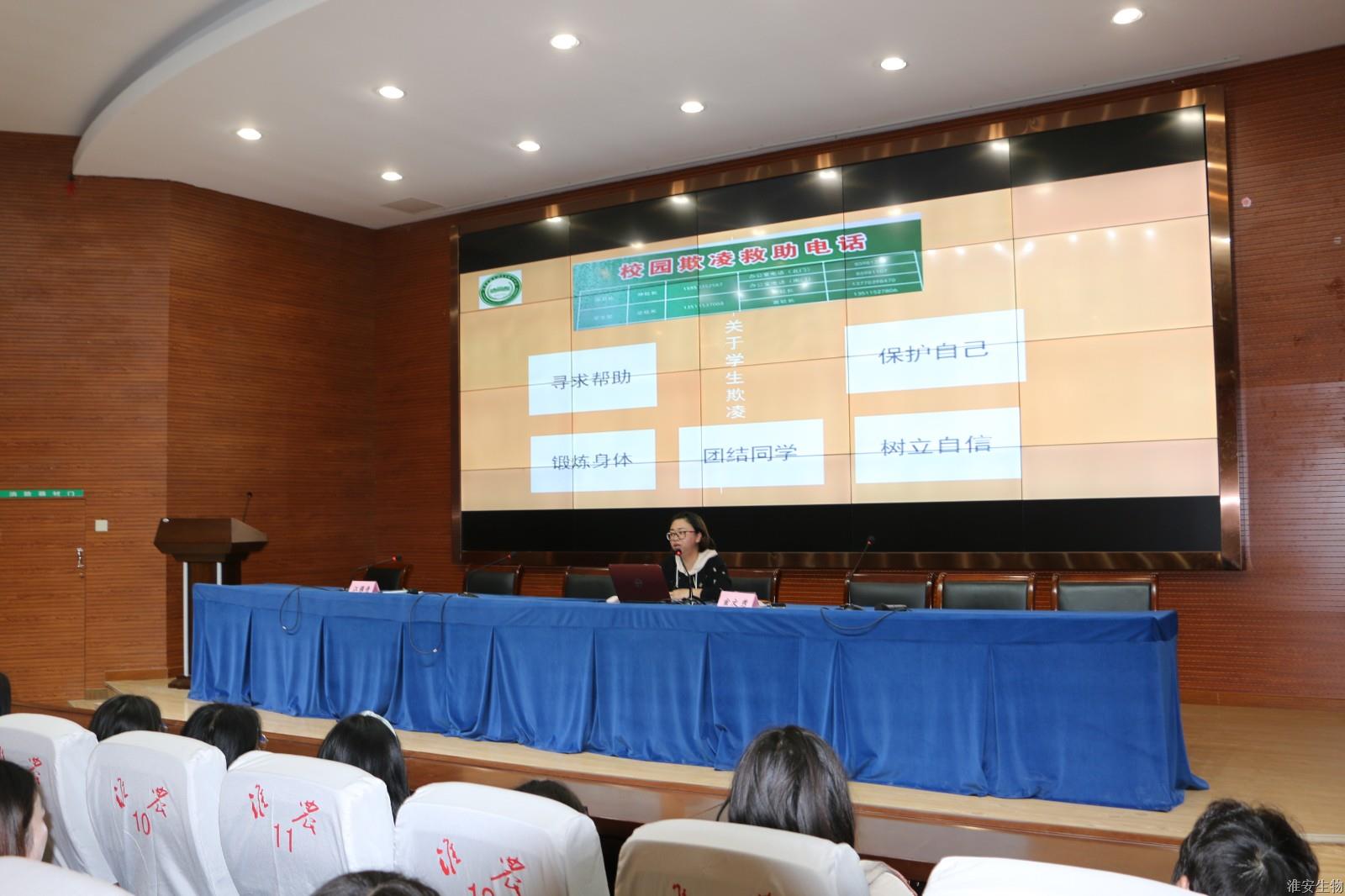 时值“5.25 我爱我”心理健康月,为更好引导全校女生树立自尊、自爱、自重、自护的意识,5月20日,淮安生物工程学校学生处副处长宣文秀利用晚自习时间,在多功能报告厅为植物工程系、动物工程系的380多名女生及班主任作首场“女生健康安全教育”专题讲座。副校长李慧亲临现场并作总结讲话。讲座由学生处江雅倩主持。