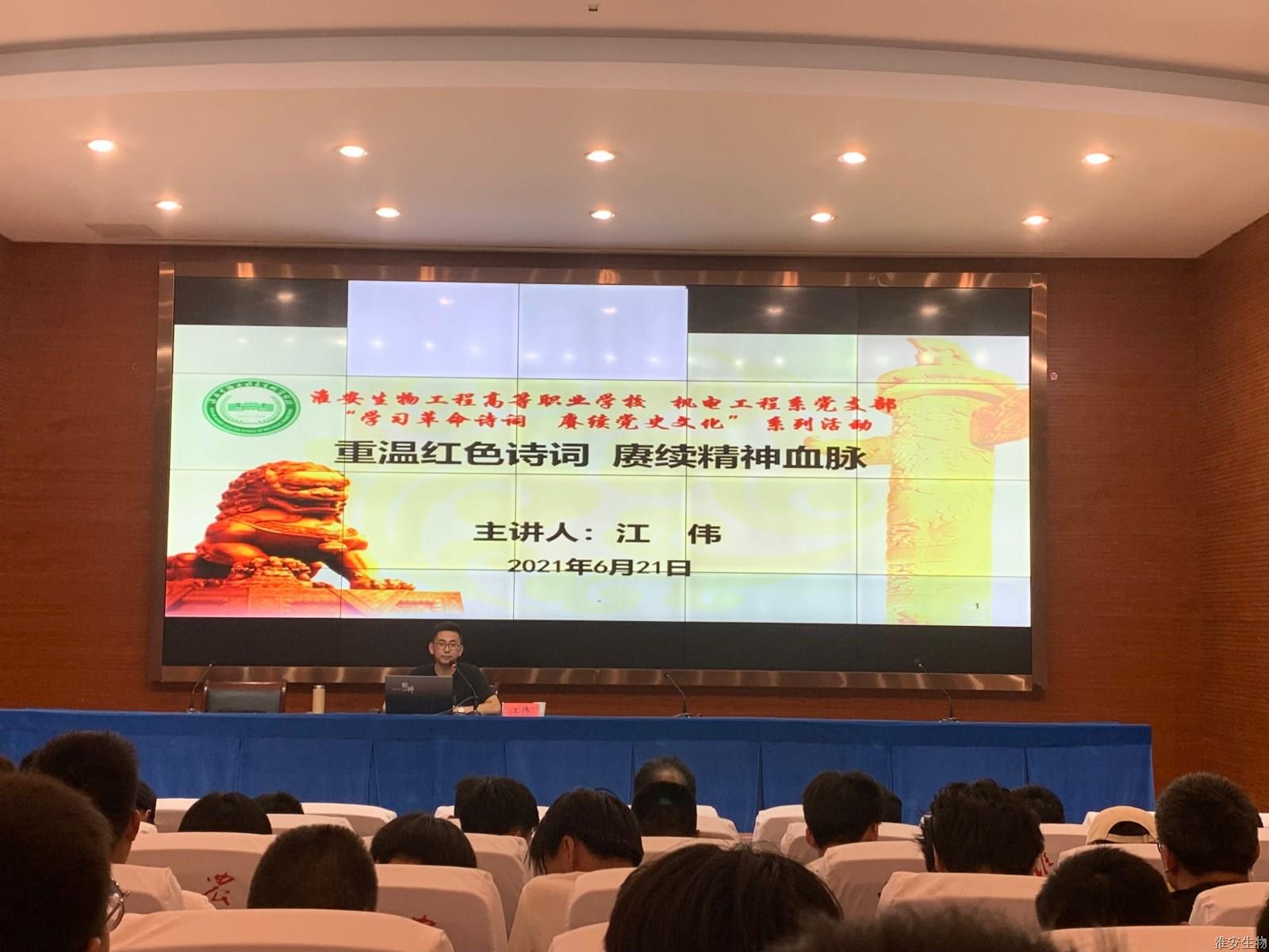 为迎接建党一百周年,深入推进系部师生党史学习教育,开展“学习革命诗词 赓续党史文化”系列活动,6月21日晚,机电工程系党支部邀请校办公室江伟老师在行政楼报告厅开展了一场以“讲解革命诗词 传承红色经典”为主题的讲座。机电工程系党支部书记陈士海、系部负责人丁宁、副主任张钦、全体班主任及学生参加了本次讲座。