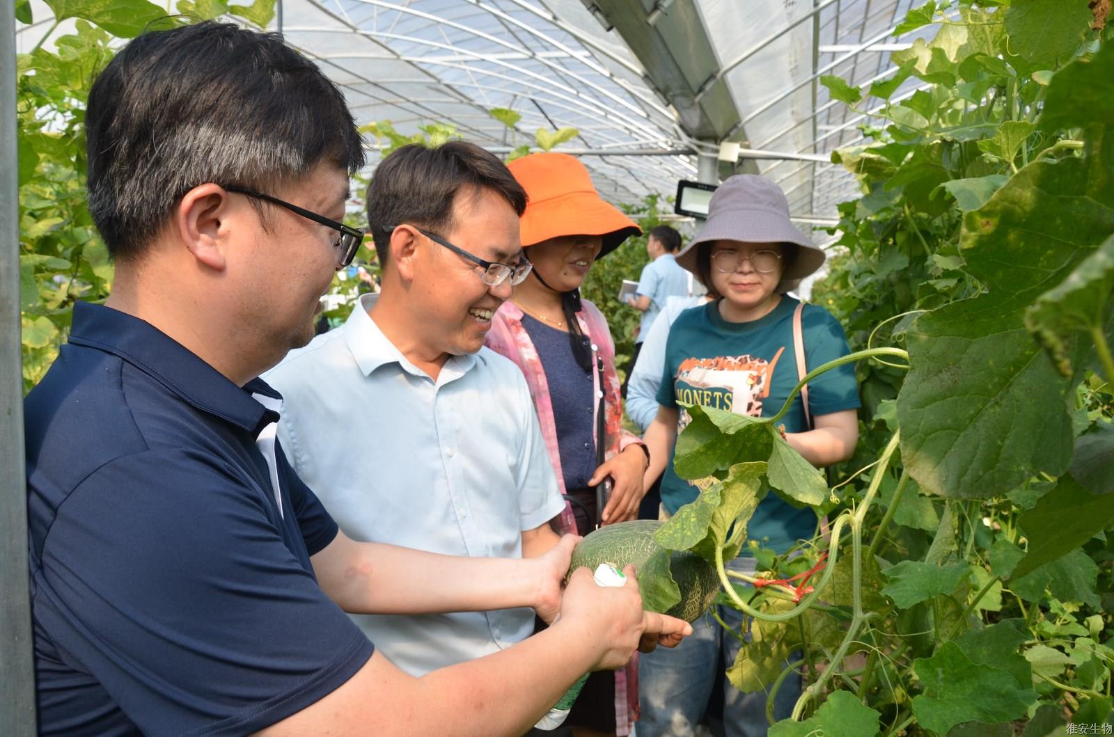 随后,淮安生物工程学校一行人在郭秋香的带领下,参观了园区瓜果、芦笋、秧苗等温室大棚。一排排硕果累累甜香扑鼻的瓜果、一簇簇远望如烟紫绿尖新的芦笋、大片大片嫩绿喜人蓬勃生长的秧苗……如潮水般生机盎然的绿色画卷扑面而来,让人喜不自禁。学校植物工程系主任徐暄激动地说:“农业农村大有可为!承包秧苗温室大棚的也是我校毕业生,他们正为近邻盐城市的秧苗订单忙活。”