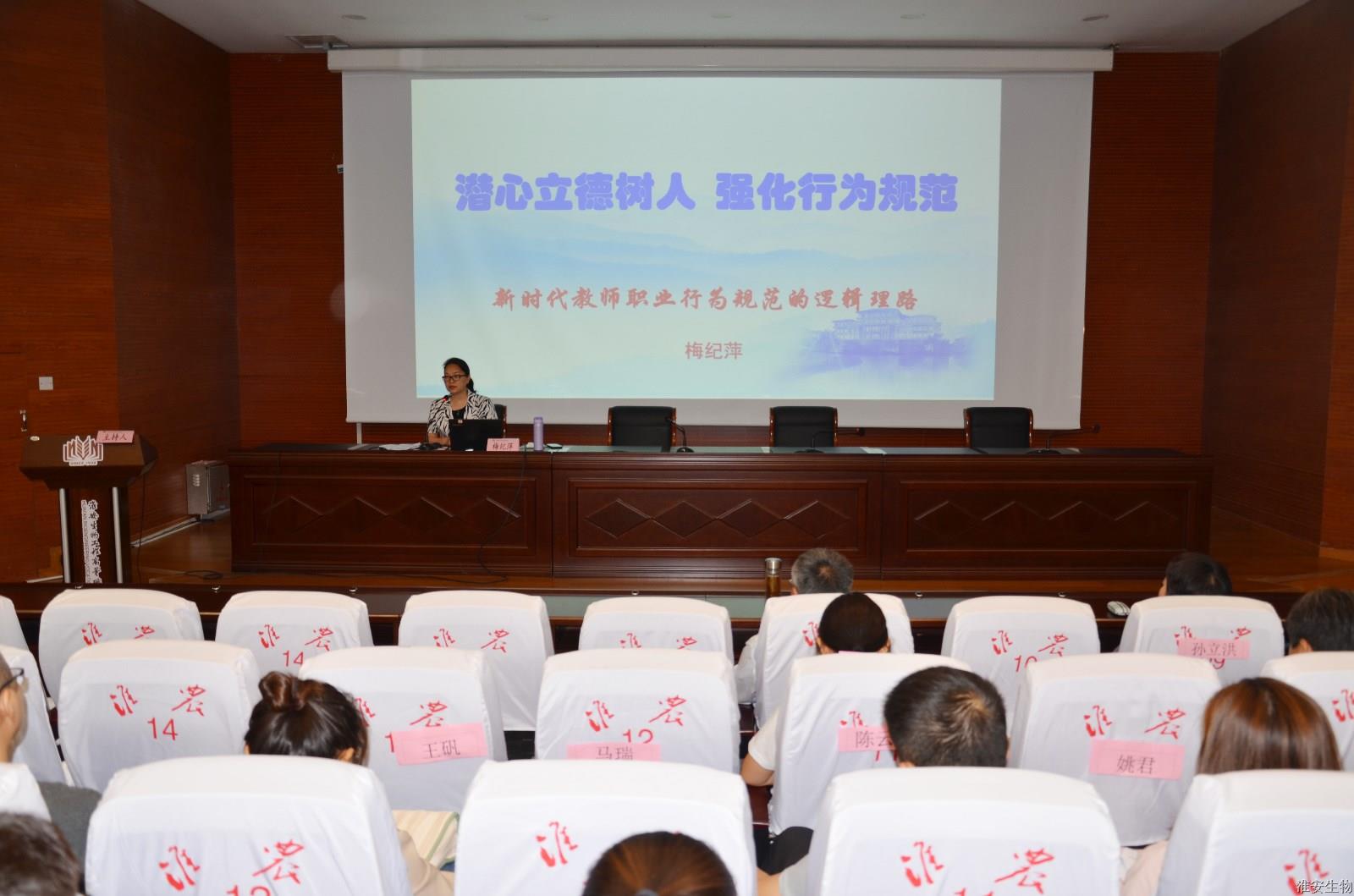 8月30日上午,江苏旅游职业学院党委副书记梅纪萍为我们作了题为《立德树人与教师行为规范》讲座。梅书记围绕新时代教师的职业角色、教师职业道德与规范、教师行为规范实践三个方面为我们进行了精彩的授课。梅书记用一个个生动的案例,为我们诠释了做人、做事、教书育人的真谛。高尚的师德是做一位好老师的立身之本。作为教师,必须做到以“德”立身、立教,用“爱”润泽人心,以高尚的师德、满腔的热情投入到育人工作全过程,助力学生成长成才。