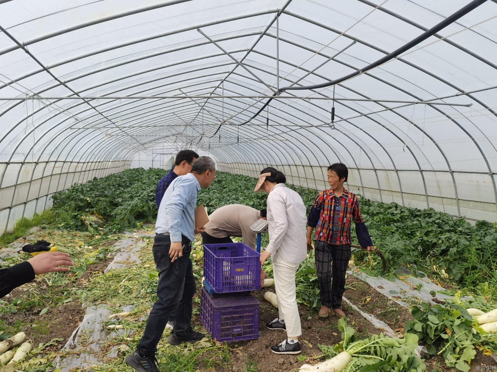 为持续推进2022年省科技帮促项目《适合中央厨房的主要蔬菜标准化栽培技术集成与示范》工作,掌握项目实施效果,4月19日,我校联合江苏省农业科学院潘宝贵研究员和郭广君博士来到项目实施基地淮安区施河镇百斯特现代农业有限公司开展蔬菜生产测产相关工作,主持人李慧,项目组核心成员仲春雷、陈绕生、孙其文等老师一起参加了活动。测产的现场充满丰收的喜悦,测产工作在科学严谨的程序指导下有序开展。生产基地负责人李滨经理表示,在课题组的科学指导下,大白菜和萝卜已经取得了大丰收,经济效益明显提高。最后,课题组还对产后土壤改良提出宝贵建议和意见。