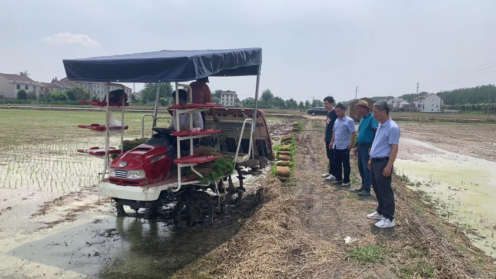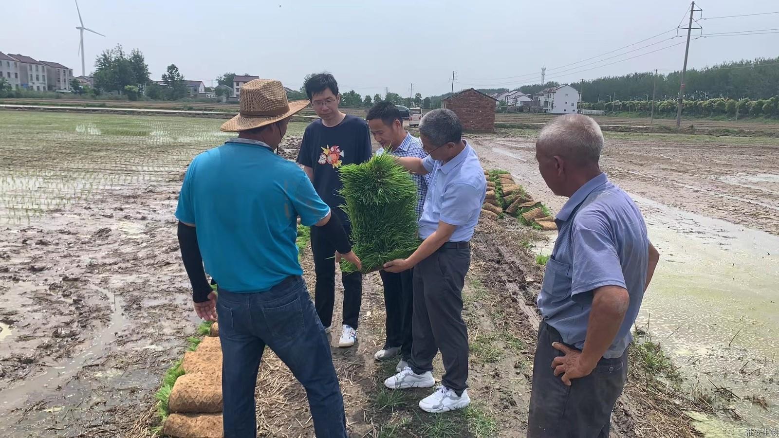 近年来,随着机械化水平的提高,机插秧作为一种高效、节约人力的水稻种植方式,越来越受到种田大户的欢迎。项目组就插秧机种类及使用、秧田平整、大田施肥、秧苗栽插规格要求以及后续工作和农场主时留戈进行指导和交流,陈绕生教授检查了秧苗的质量,苗齐、苗匀、苗壮,为高产打好基础。整个插秧操作按照生产过程有条不紊地进行,推进项目正常实施。