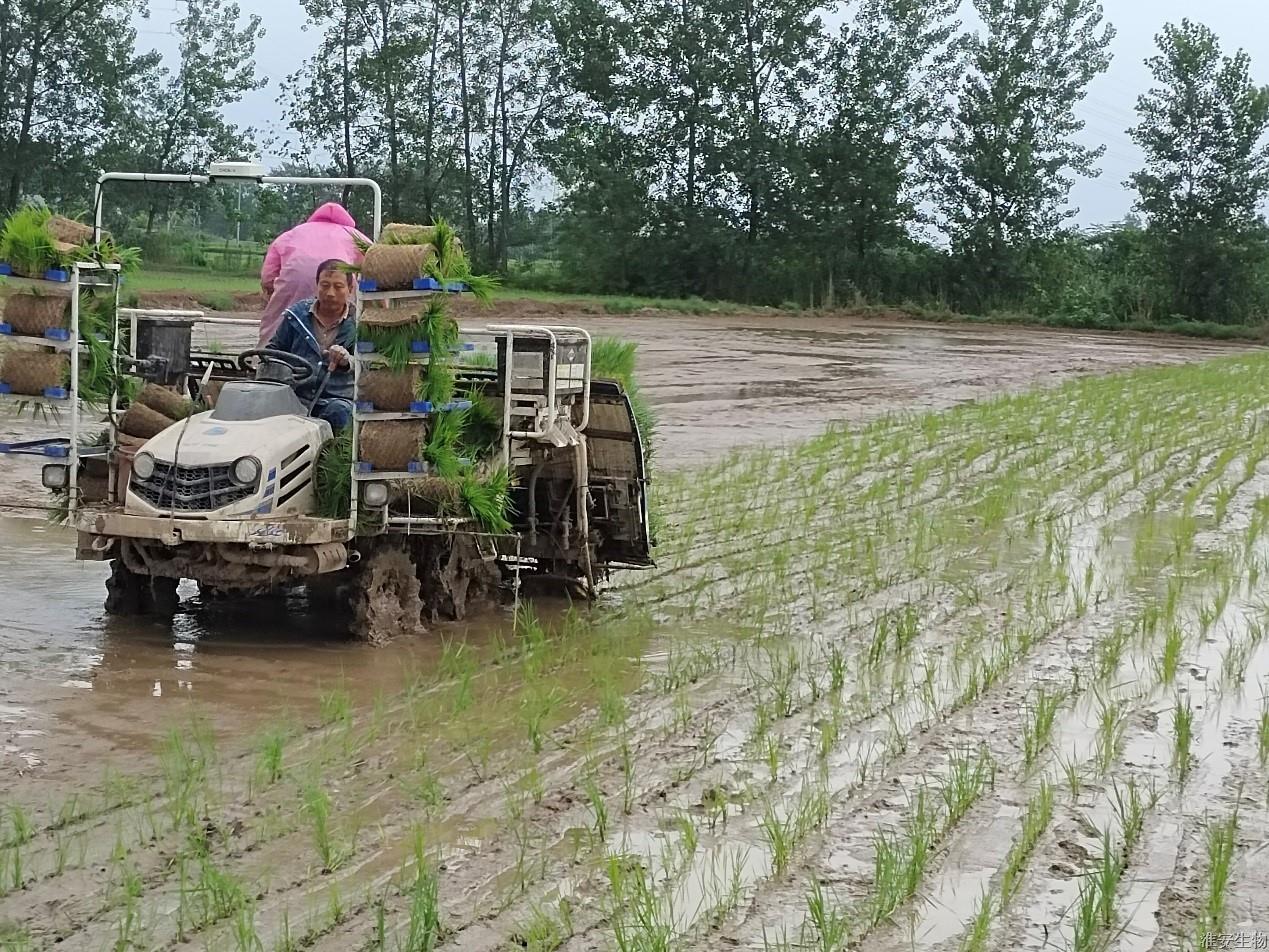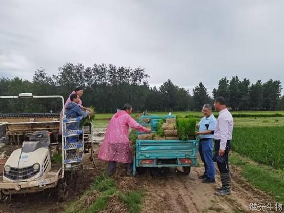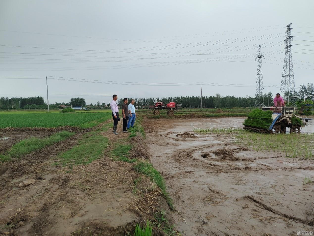 7月6日下午,淮安生物工程学校科技服务团队冒雨赶赴项目基地江苏丰济仓生态农业发展有限公司指导实施水稻机插秧工作。为了持续推进2022年淮安市重点研发计划(乡村振兴类)项目《优质稻米南粳66示范种植与推广应用》工作,实时动态掌控实施进度与效果,学校科研处处长仲春雷和植物工程系陈绕生教授参加本次活动。服务团队对接种田大户乔林中就插秧机使用问题、施肥量多少、耙地质量要求、秧苗大小和栽插规格以及在稻田中放鱼苗、鸭苗混养等后续工作的安排进行充分交流与沟通。陈绕生教授检查了秧苗质量和栽插质量,发现秧苗生长过快,机插过程中容易出现缺苗现象,这些问题将直接影响日后产量,及时建议采取了秧苗喷洒多效唑和人工补栽的补救措施。整个插秧过程有条不紊地进行,推进项目正常实施。