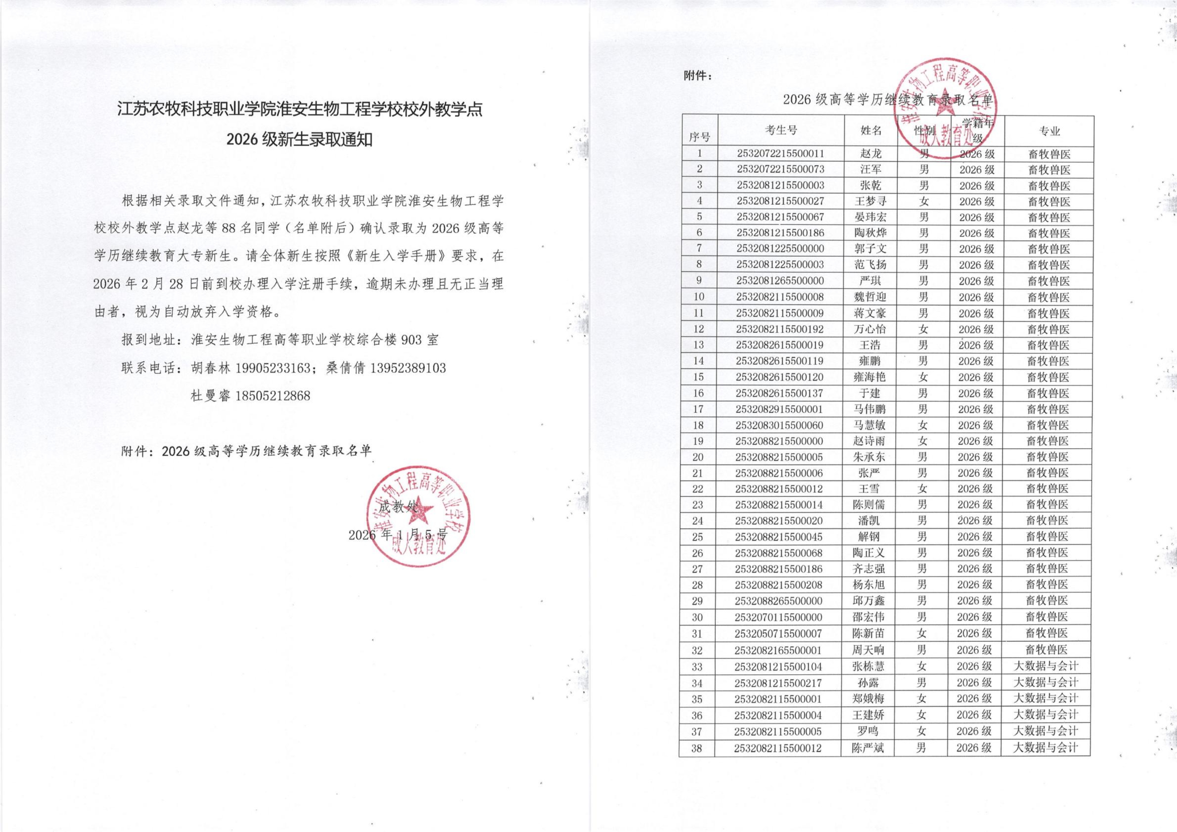 江苏农牧科技职业学院淮安生物工程学校校外教学点 2026级新生录取通知