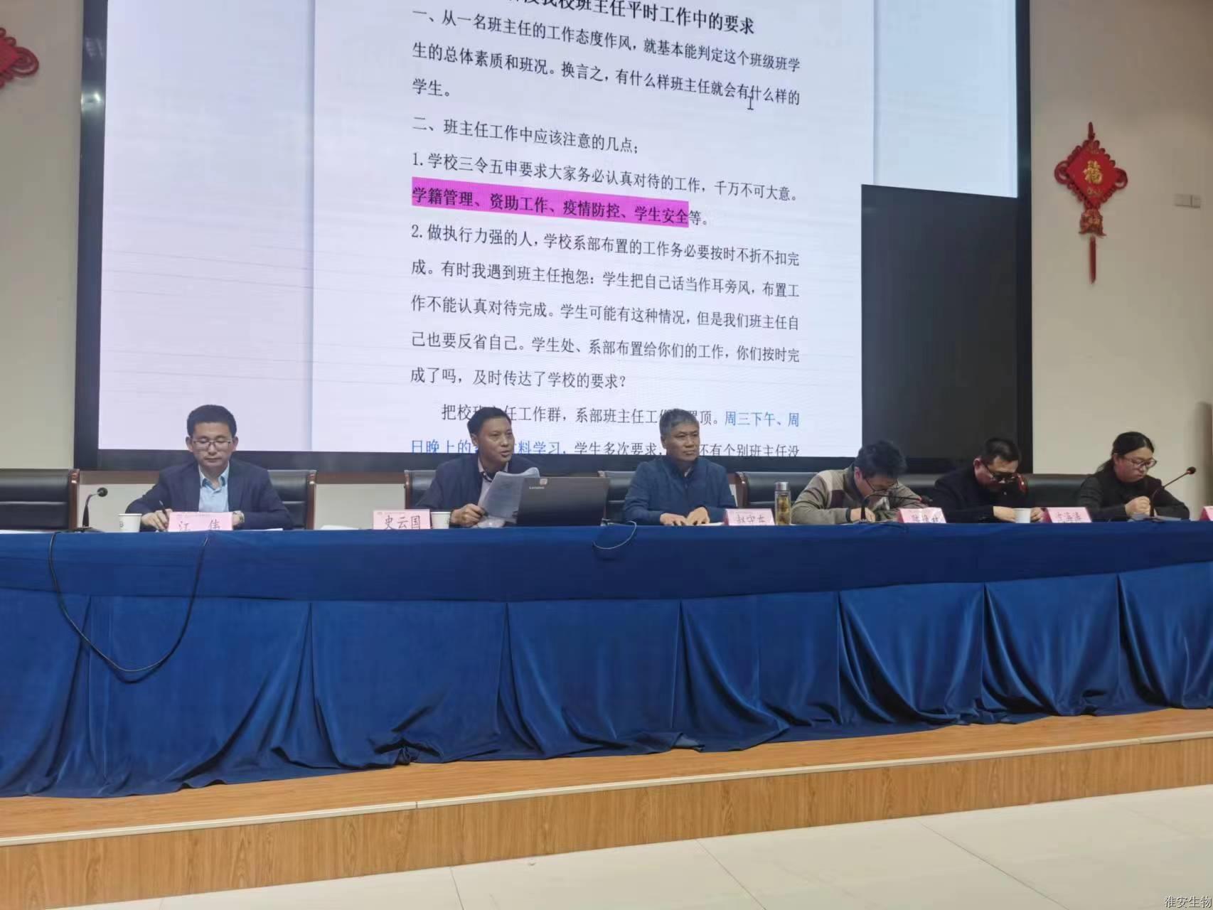 史云国要求全体班主任:一要认真对待学籍管理、资助、疫情防控工作,要关注意识形态以及学生生命安全和网络安全等学生管理工作。二是做执行力强的人,学校系部布置的工作务必按时不折不扣完成。三是做一个勤快的班主任,常到班级宿舍、教室,与任课老师沟通交流,与学生谈话,动态掌握学生学习、生活情况。四是认真对待班主任值班问题,确保问题发生时相关责任人能够第一时间到达现场并处理。