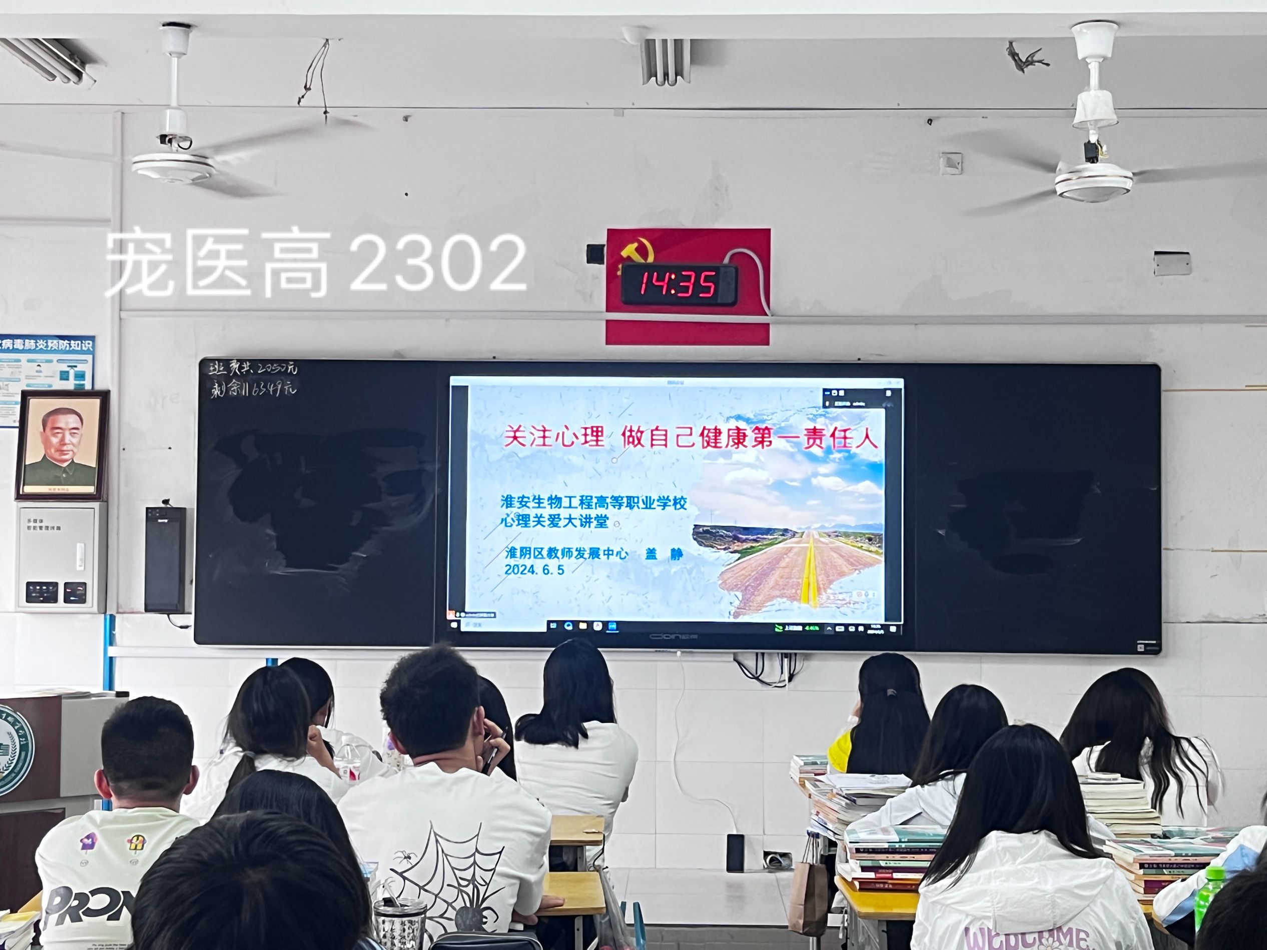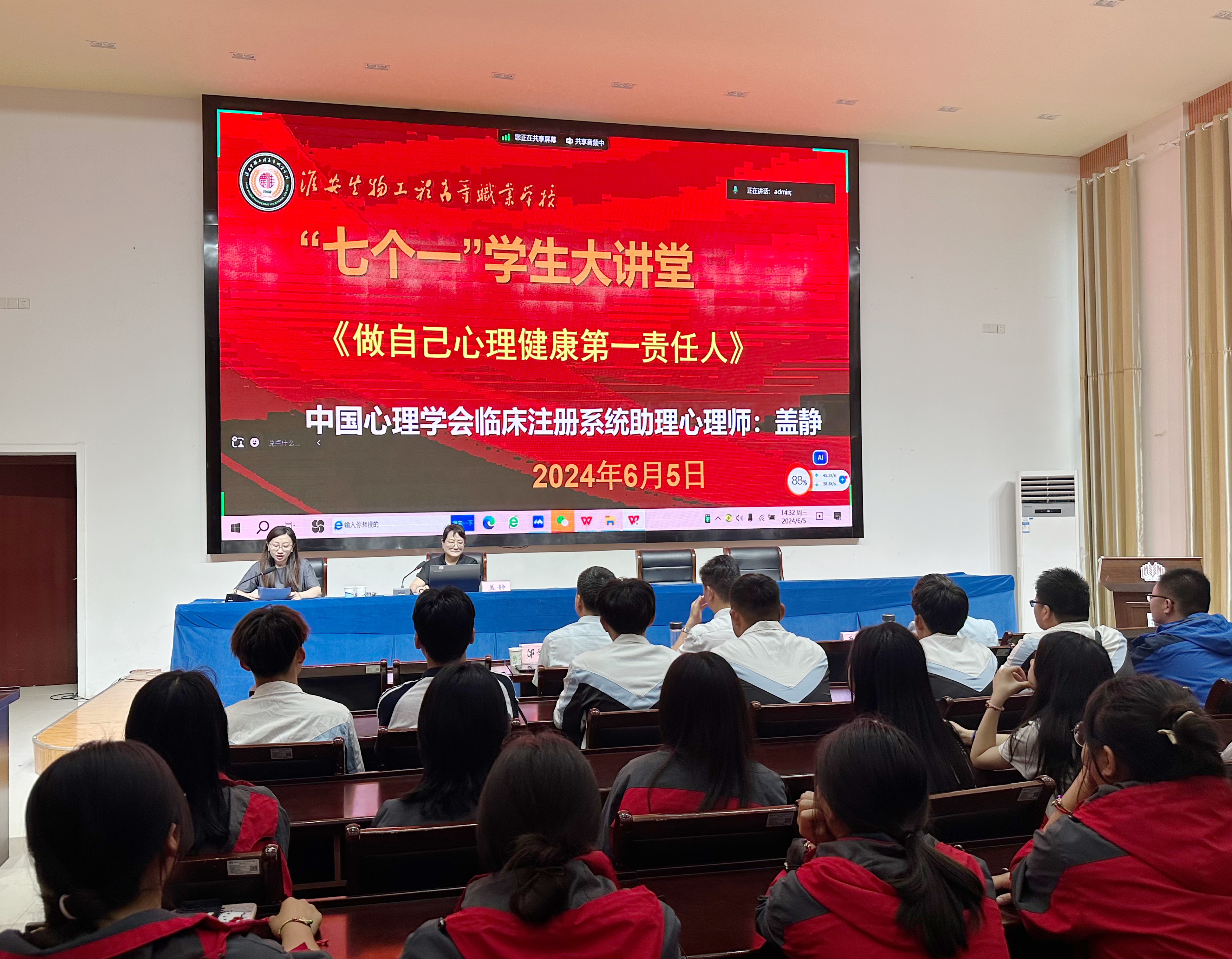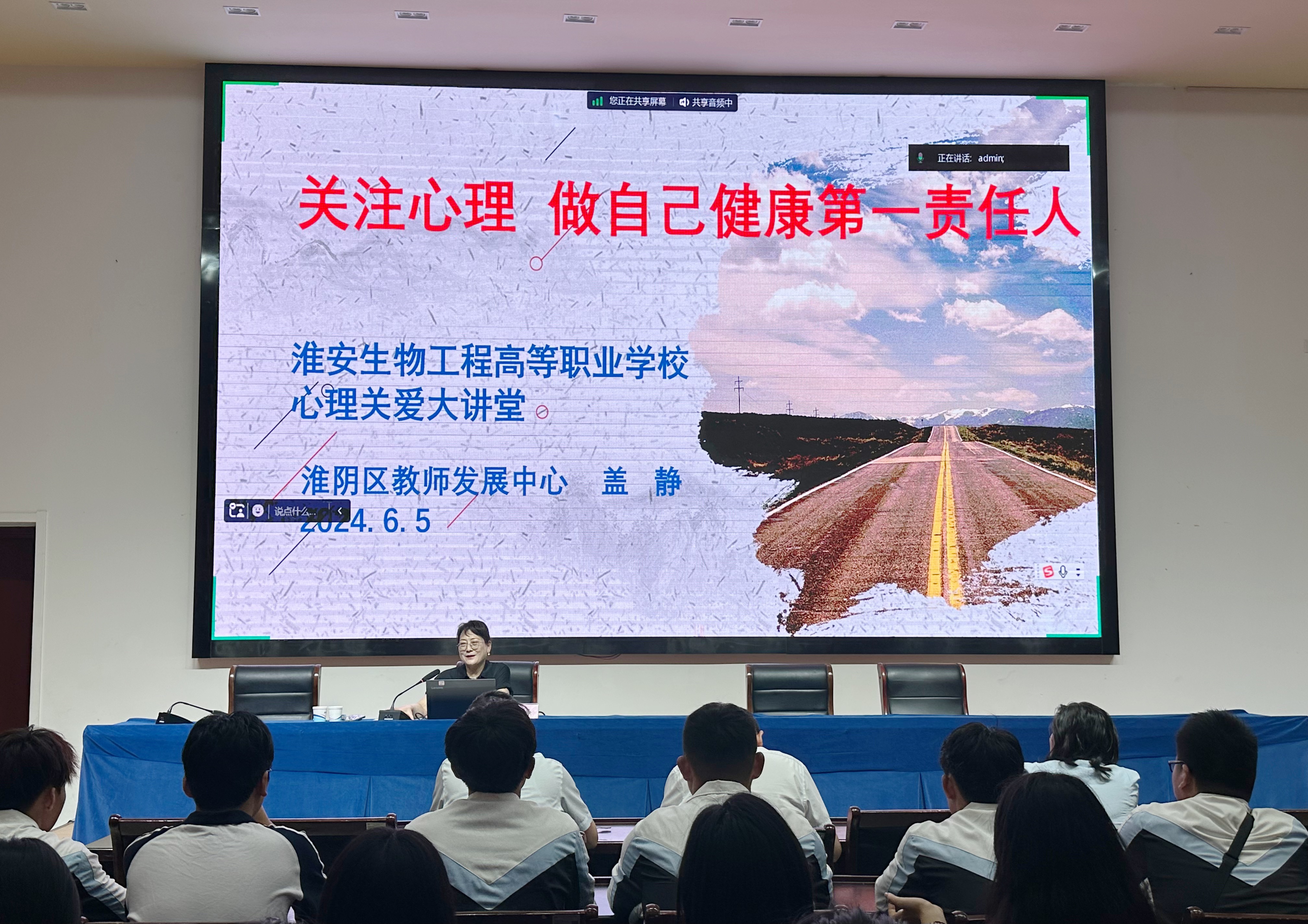 为贯彻落实校党委“七个一”“每月一次学生大讲堂”工作机制,根据“爱心红网”心理健康护航行动年度工作安排,2024年6月5日下午,淮安生物工程学校以《关注心理 做自己健康第一责任人》为主题,采用视频讲座方式,组织全体在校生收听收看专题讲座。校领导班子成员在农业实训楼124主会场参与本次讲座。
