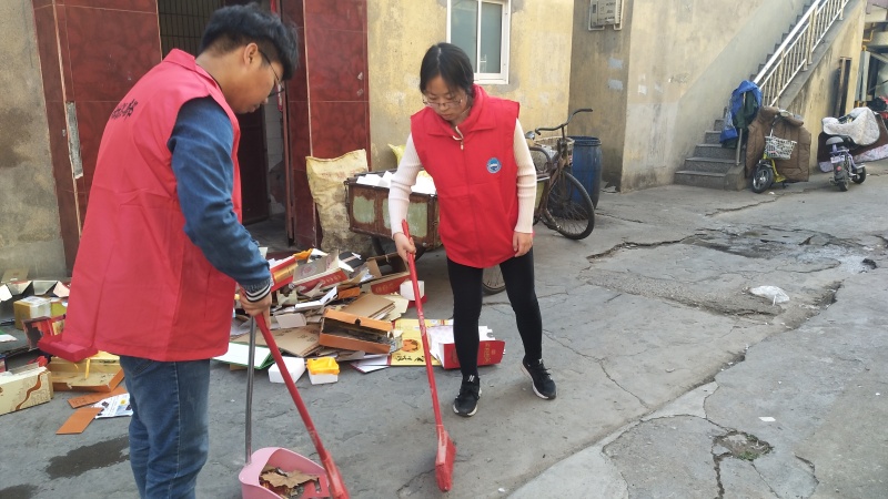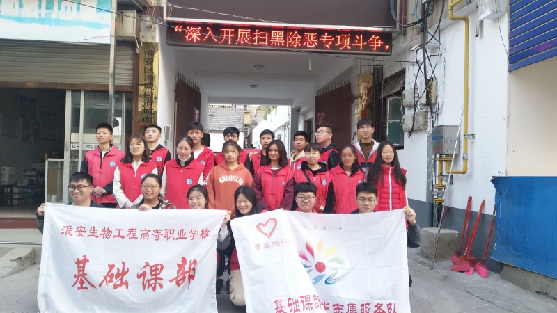 10月28日上午7点,基础课部副主任朱庆胜、团支部书记李凌芬、班主任张琪带领21名学生扛着旗子,拿着劳动工具,迎着朝阳,踏着轻快的步伐赶往城南社区参加志愿活动。