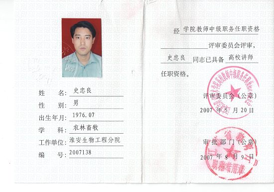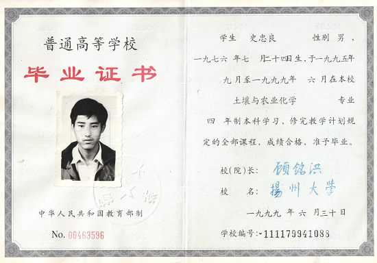 史忠良(1976.07月--),江苏楚州人,中共党员,讲师职称。1999年毕业于扬州大学农学院土壤与农业化学专业,大学本科学历,农学学士学位,农业推广硕士在读。主要从事教学及教学管理、科研。