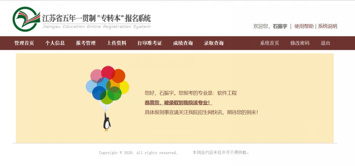 近日,江苏省2020年五年一贯制“专转本”考试成绩公布,计算机工程系软高1501班级石振宇同学通过“专转本”考试,被南京工业职业技术学院软件工程专业录取。