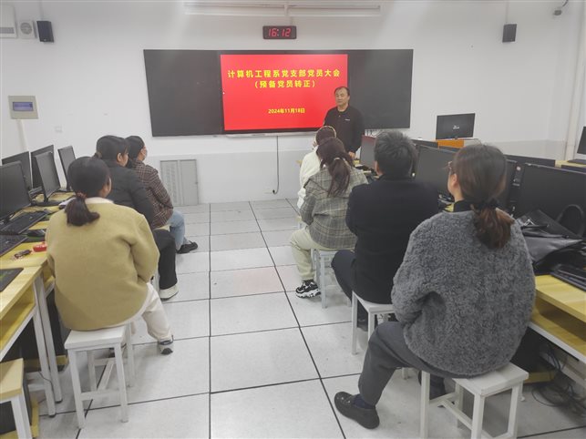 2024年11月18日下午,计算机工程系党支部在综合楼703机房分别召开支委会和支部党员大会,专题研究支部预备党员转正事项。两场会议都由支部书记李峰同志主持,全体支委和支部党员分别参会。支部党员大会在集体讨论后,经举手表决一致同意支部学生预备党员软高1901班刘冯飞同学的预备党员转正申请。党员大会结束后,支部组织委员倪睿文同志及时按规完成预备党员材料上报工作。