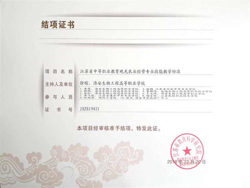 ”江苏省中等职业教育观光农业经营专业技能教学标准“结项证书