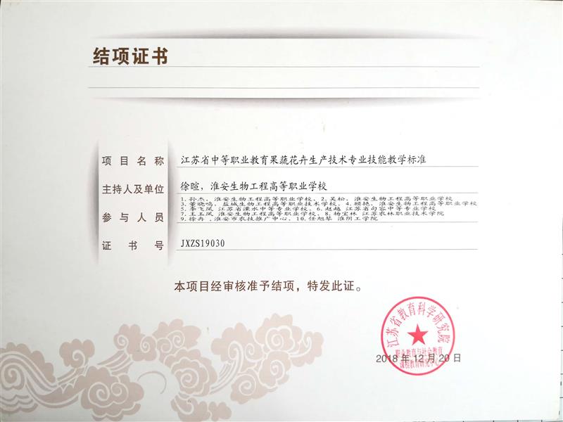 ”江苏省中等职业教育果蔬花卉生产技术专业技能教学标准“结项证书