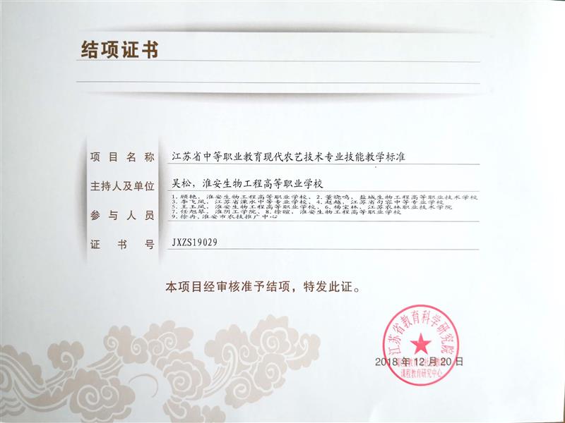 “江苏省中等职业教育现代农艺技术专业技能教学标准”结项证书