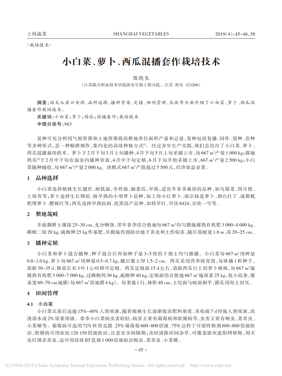 工作室成员陈绕生论文《小白菜、萝卜、西瓜混播套作栽培技术》