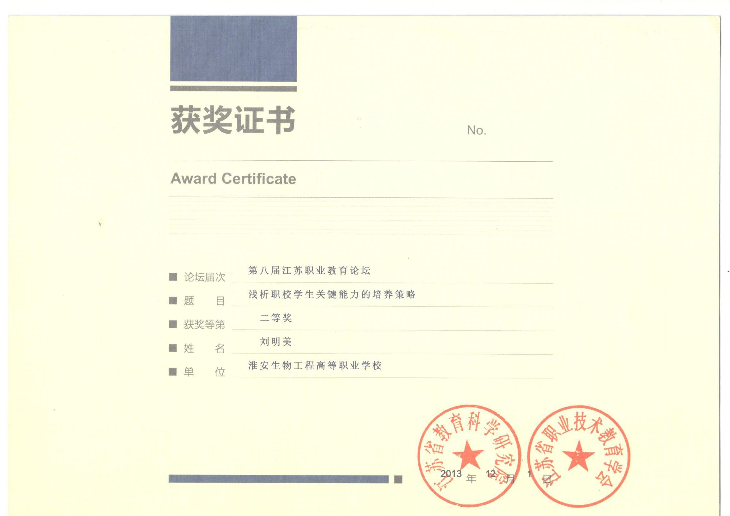 刘明美2013职教论坛二等奖