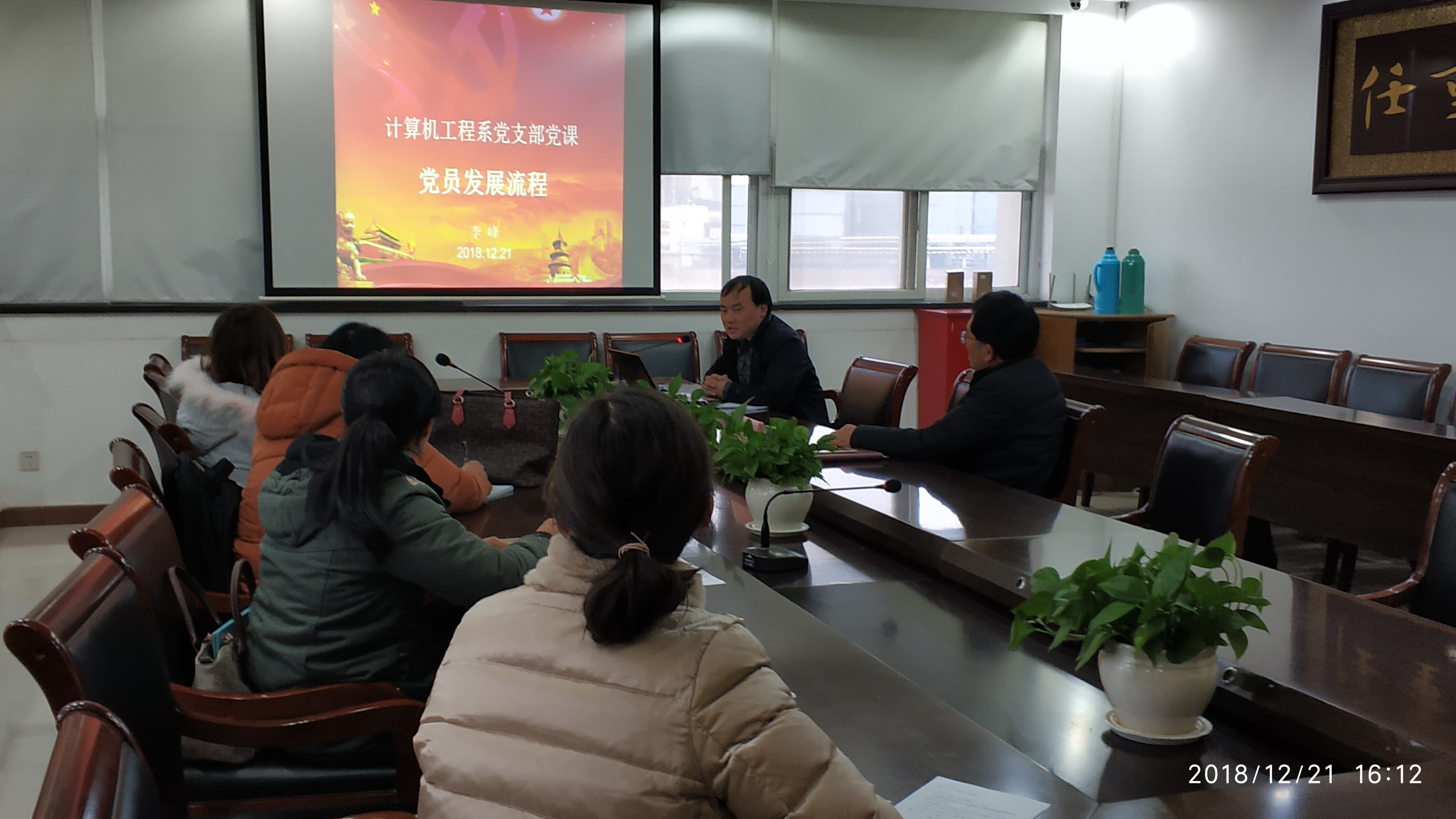 2018年12月21日下午,在校行政楼三楼会议室,计算机系开展专题党课学习活动。本次党课由系支部书记李峰同志主持,校党委副书记石国安同志、系支部书记李峰同志分别给大家主讲党课。系部全体党员参加了党课学习活动。