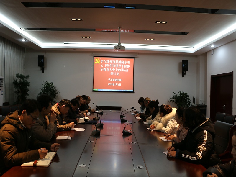 按照学校党委工作部署,学生工作处党支部于2019年1月4日组织支部全体党员在新实训楼119会议室召开学习中共淮安市委姚晓东书记《在全市领导干部警示教育大会上的讲话》交流会。首先大家一起学习姚书记讲话全文,然后进行讨论。与会同志积极发言,联系实际谈了学习姚书记讲话的感受。