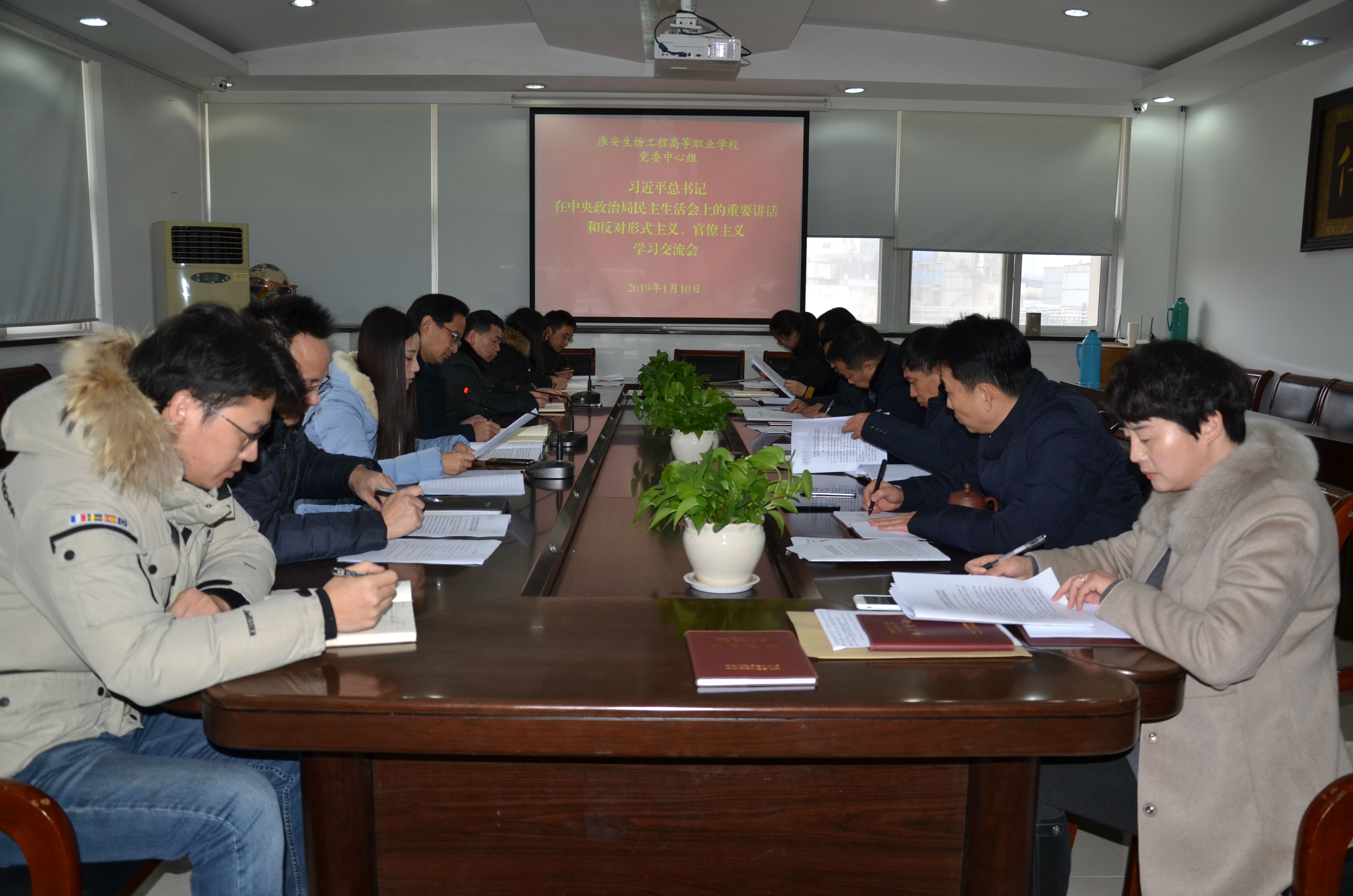 1月10日上午,淮安生物工程高等职业学校党委中心组(扩大)在行政楼三楼会议室召开《习近平总书记在中央政治局民主生活会上的重要讲话》和《姚晓东在全市集中整治形式主义官僚主义工作会议上的讲话》专题学习会。校领导班子全体成员、办公室党支部和教学党支部部分党员代表参加了学习会。