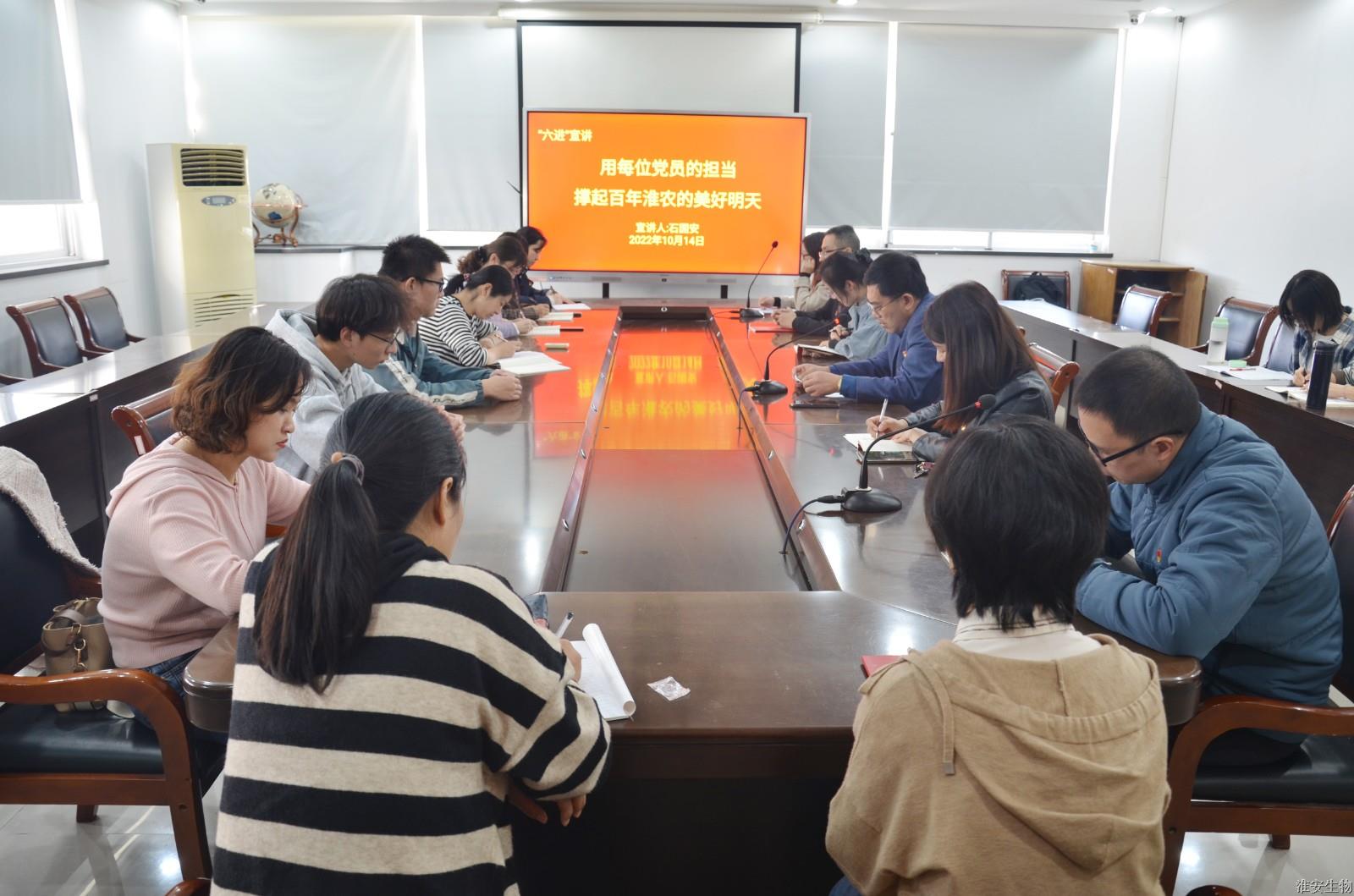 会上,石国安作了题为《用每位党员的担当撑起百年淮农的美好明天》的专题报告。他指出,敢于担当是中国共产党人鲜明的政治品格。中国共产党自诞生之日起就自觉把对国家、对民族、对人民的责任担当写在自己的旗帜上。他强调,担当是一种责任、一种能力、一种工作作风、一种思想境界。他要求与会党员深入领会习总书记系列重要讲话精神,一要甘于担责、二要乐于担事、三要勇于担错、四要勤于担忧、五要善于担难。只要每个党员敢于担当,百年淮农的明天一定会更加美好。