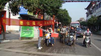 10月20日上午8点,志愿者们佩戴着统一的蓝色志愿者帽子,身穿统一志愿者服装,来到了楚州区的各交通路口开展了义务维持秩序,劝导市民遵守交通法律法规,及时纠正市民乱穿马路、翻越护栏、不走人行道,机动车随意行驶、乱闯红灯的现象。志愿者们通过"你好"等亲切的问候向社会公众传递文明,推广礼仪。在交通路口,耐心地劝导每一位违反交通法规的市民,协助交警搞好文明交通工作。在整个志愿服务活动中,虽然站着很辛苦,但志愿者们依然微笑面对,耐心地劝导路人,使每个人都参与到文明礼仪推广活动中,志愿者用微笑、热情、礼貌感染了路人,让他们自觉加入到活动的队伍中,为活动增添了色彩。