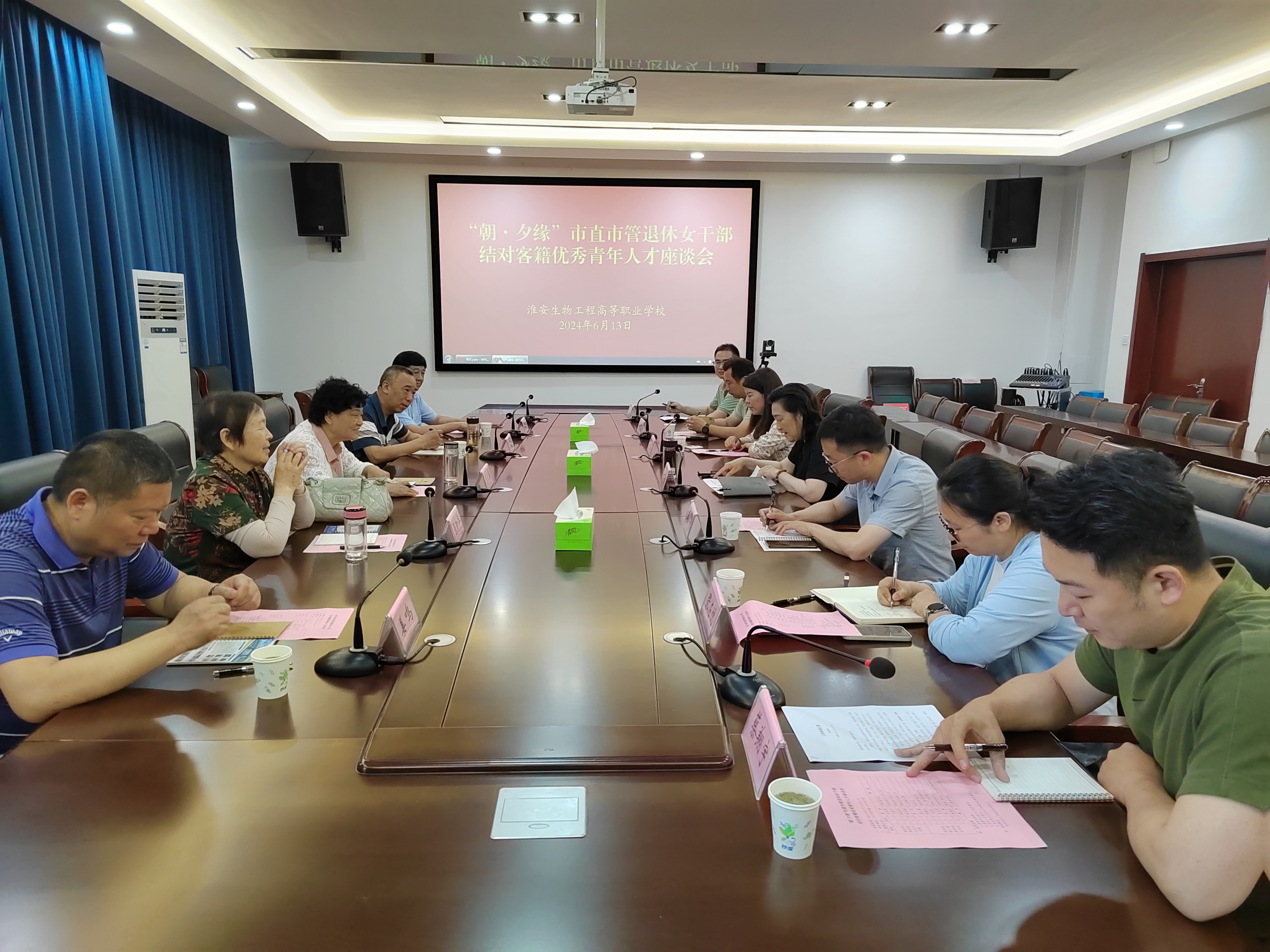 6月13日,淮安生物工程高等职业学校、淮安市高级职业技术学校共同召开“朝·夕缘”市直市管退休女干部结对客籍优秀青年人才座谈会,与会人员围绕励志逐梦主题和淮安生物工程学校“青苗计划”,开展座谈交流。淮安市高级职业技术学校原纪委书记张农英、原党委办公室主任卞海宁、原机电系副主任张新华、原就业办副主任蒋同群、工会副主席姜鸣出席会议。淮安生物工程学校副校长禹立馨主持会议;淮安生物工程学校基础课部、植物工程系、办公室、学生处、人事处等部门人员参加座谈。