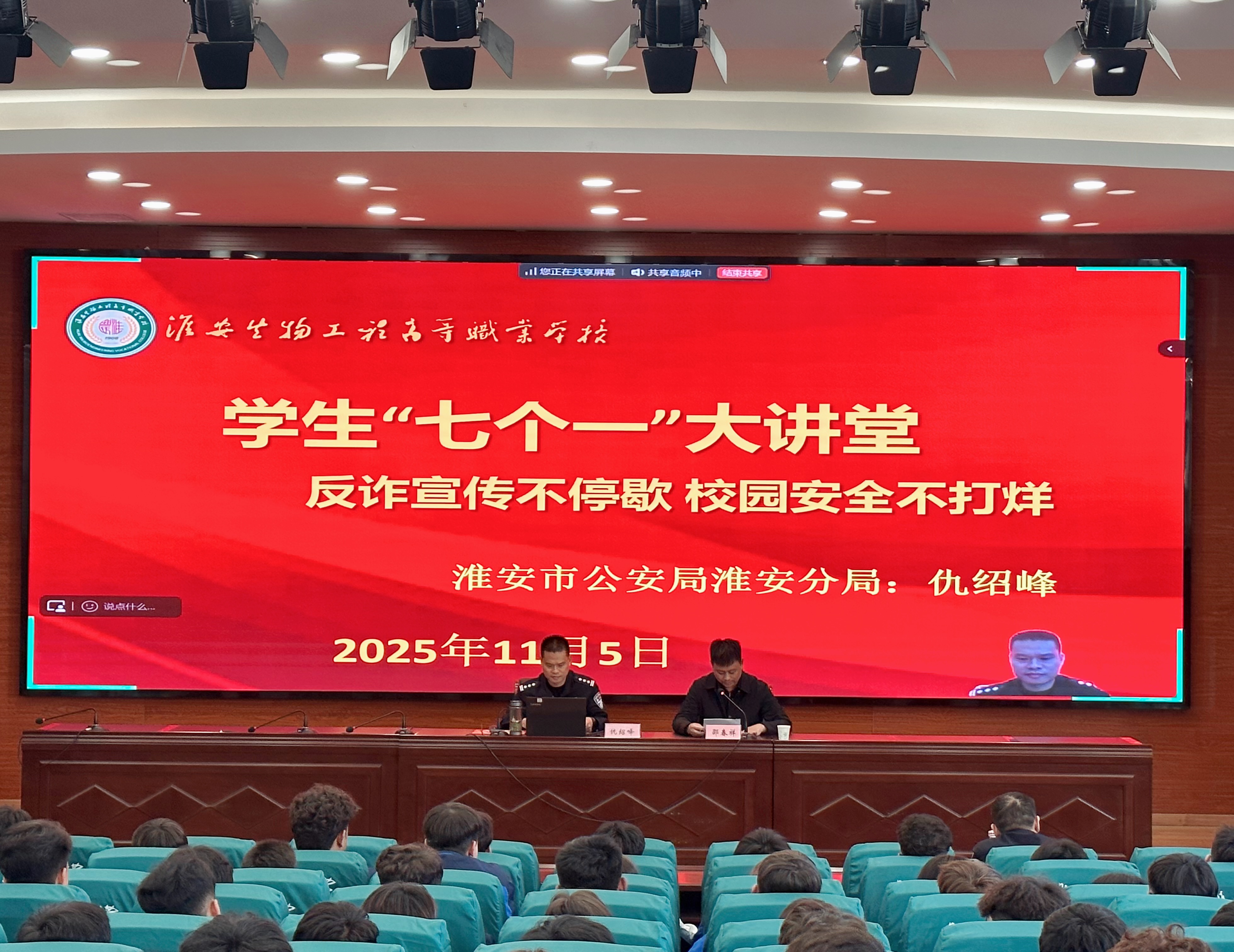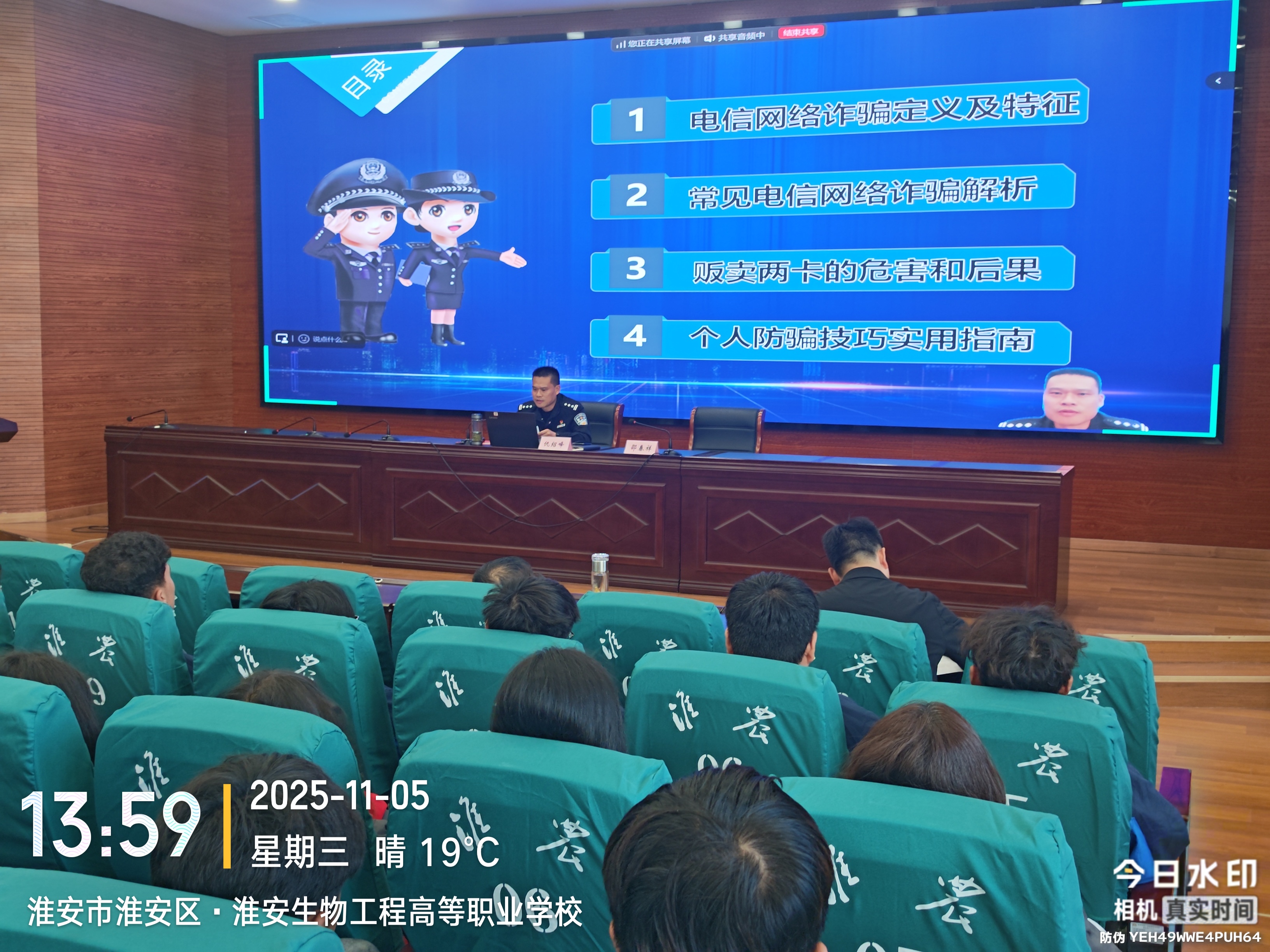 在校园安全建设持续推进的背景下,淮安生物工程学校“学生大讲堂”于2025年11月5日聚焦反诈、反恐、反霸凌主题,联合淮安市公安局淮安分局开展专题宣讲。活动由分局副局长、学校法治副校长仇绍峰主讲,淮安生物工程学校副校长邵春祥主持本次宣讲。活动采用“线上+线下”双模式——民族教育处学生代表在多功能报告厅现场参与,其余学生在教室同步收看,以“警校联动、师生同心”的合力,为全校学子筑牢安全防护网。