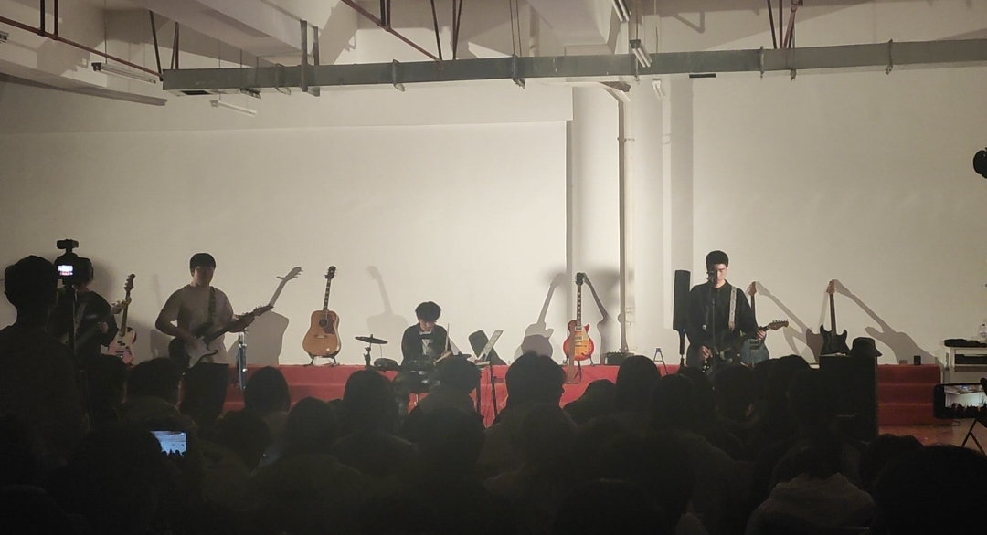 本次活动精心设计的三个篇章递进式表演结构,让观众在旋律流转中沉浸式感受吉他音乐的多元魅力,实现情绪的自然释放与心理的悄然滋养。第一篇章“伴奏演唱”中,社团成员陈晨以温柔声线演绎歌曲《我是如此相信》,瞬间让现场安静下来,传递出对生活的热爱与对他人的关怀,让在场学子在旋律中感受到被理解的温暖。第二篇章“器乐弹唱”聚焦技巧展现与情感表达的融合,夏雪同学娴熟弹奏的指弹《风之诗》勾勒出诗意画面,让学子在舒缓节奏中放松身心。压轴的第三篇章“乐队表演”中,迷途乐队以摇滚张力点燃氛围,释放出青春奋斗的激情与力量,接连献上《白日梦蓝》等五首金曲,鼓点与吉他碰撞出强劲节奏,主唱高亢嗓音引发全场大合唱,在集体呐喊与歌唱中,学子们释放了学习生活中的压力,凝聚起青春奋进的力量,将活动推向高潮。