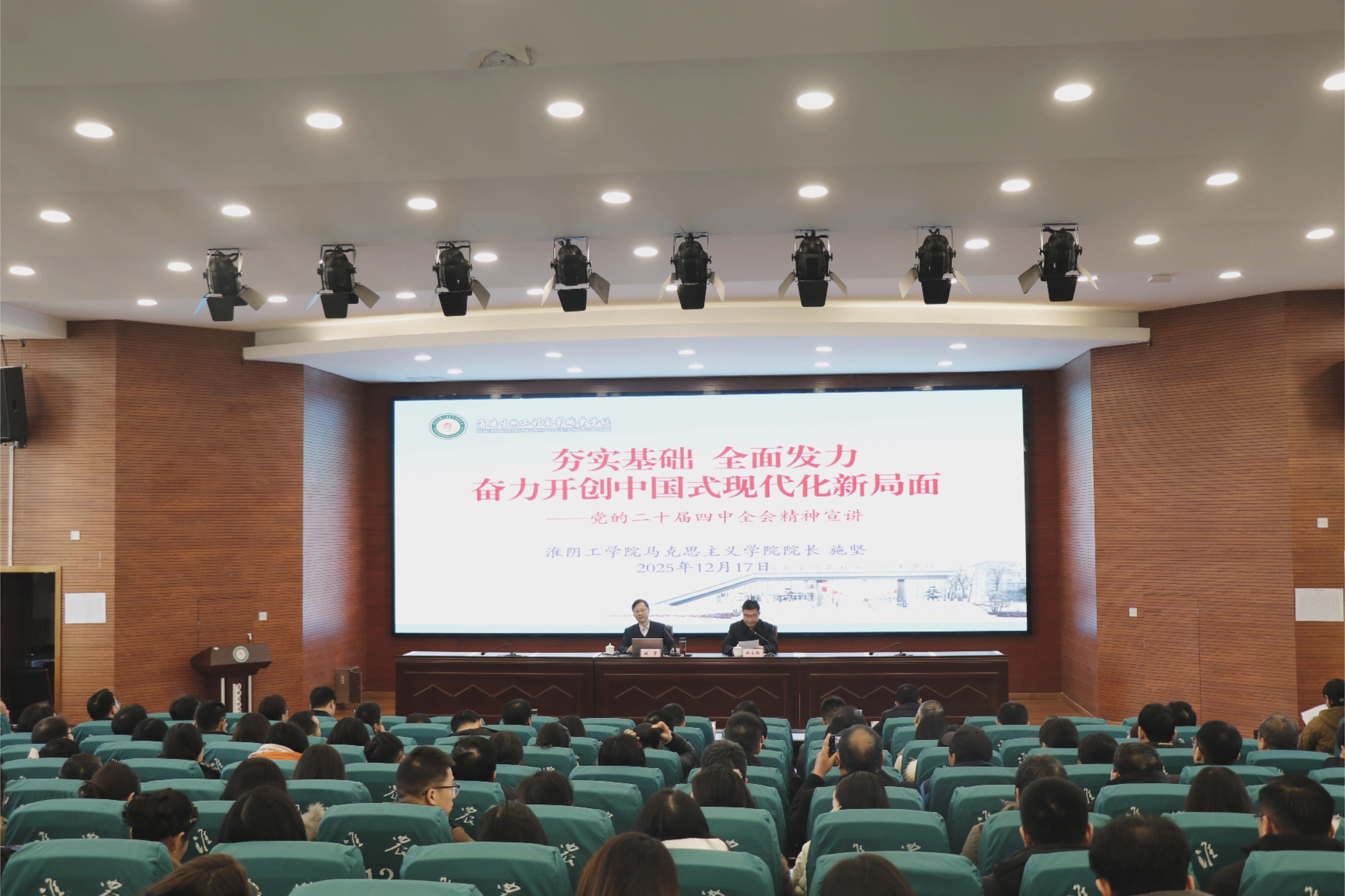 根据市委统一部署,12月17日,学习贯彻党的二十届四中全会精神市委宣讲团报告会在淮安生物工程学校举行。市委宣讲团成员、淮阴工学院马克思主义学院院长施坚作宣讲报告。校党委书记韩永胜主持报告会。全体教职工参加学习。