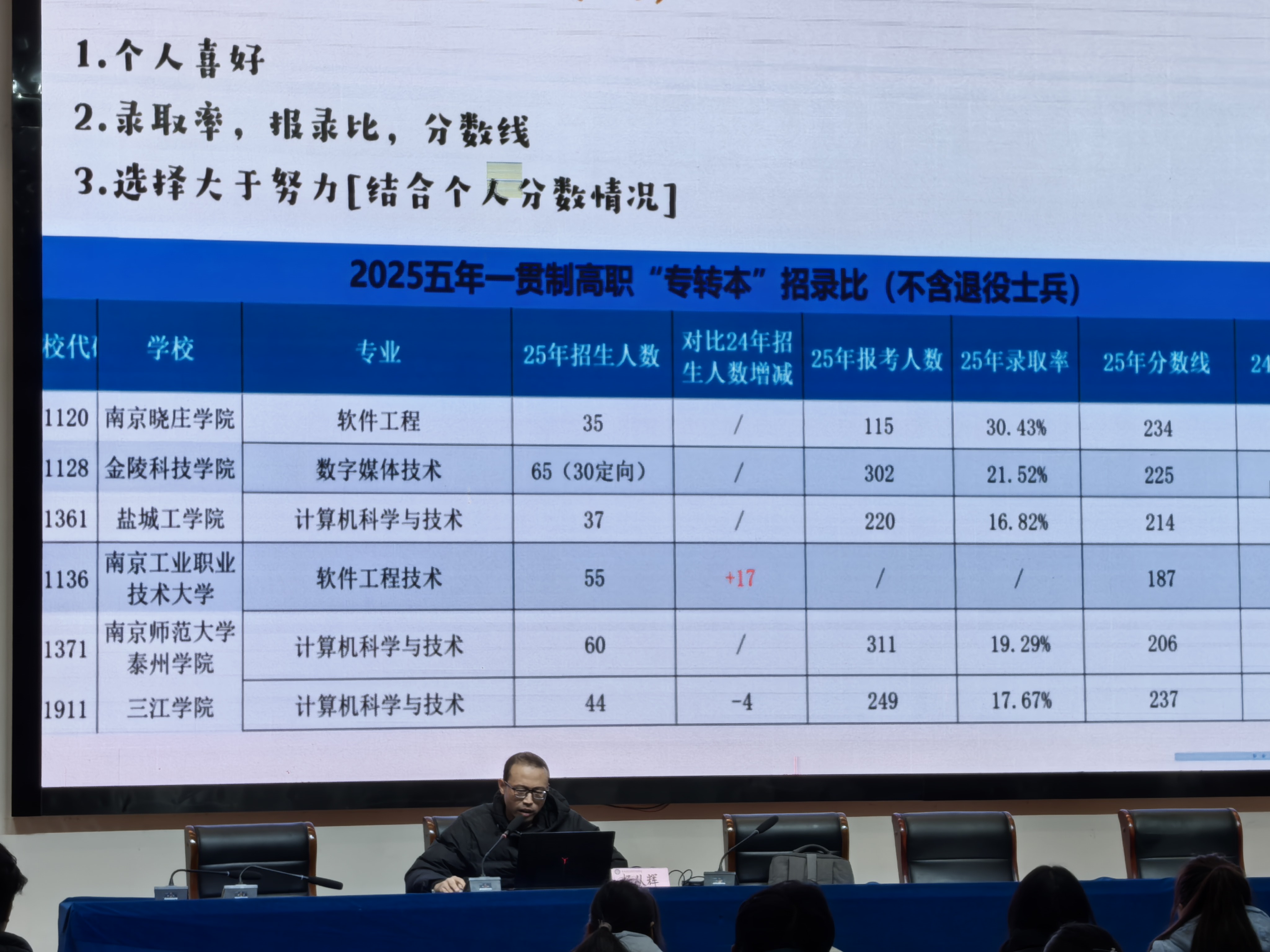 讲座中,杨从辉老师紧扣学生关切的核心问题,围绕政策解读、考试要点与备考策略三大维度展开系统讲解。他首先强调,五年一贯制“专转本”是江苏省五年制高职学生获取全日制普通本科第一学历的唯一正规通道。通过考试的学生将进入本科高校完成两年全日制学习,所获学历国家认可、含金量高,对个人发展具有重要意义。