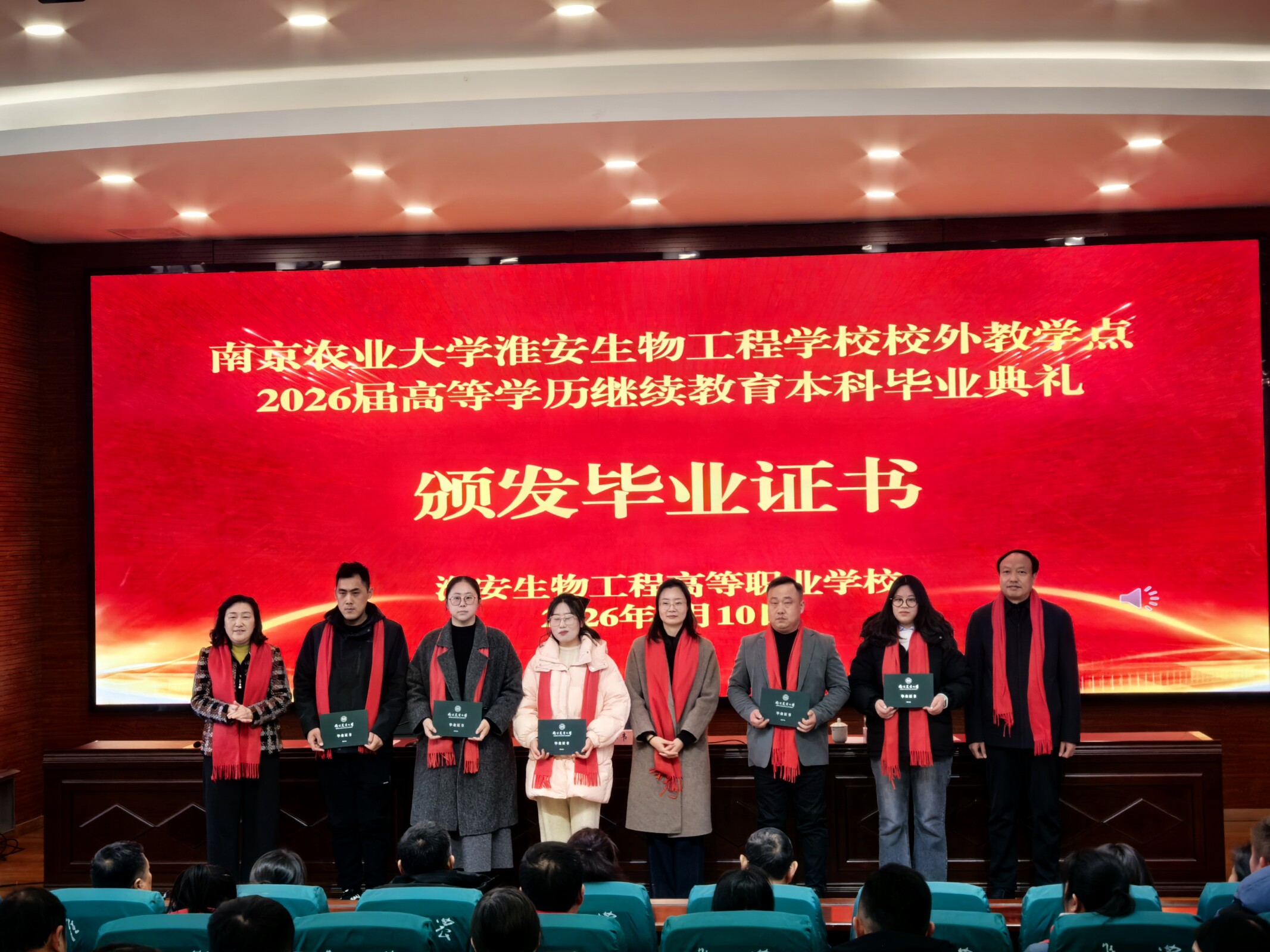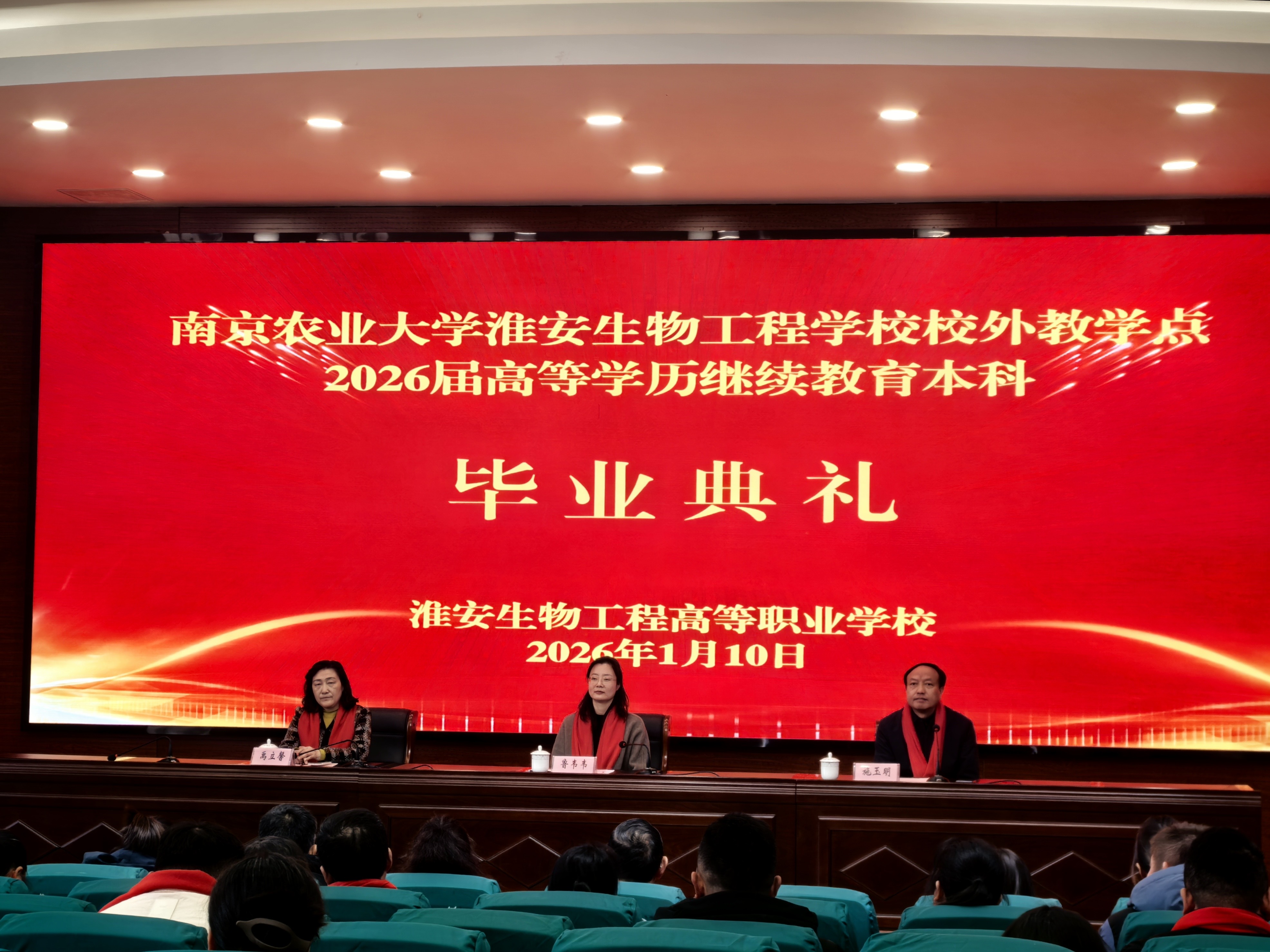 1月10日上午,南农大淮安生物工程学校教学点2026届高等学历继续教育本科毕业典礼在报告厅举行。南京农业大学继续教育学院副院长鲁韦韦,淮安生物工程学校校长施玉明、副校长禹立馨出席典礼。2026届全体毕业生、毕业生家属共同见证了这一庄严而喜悦的时刻。