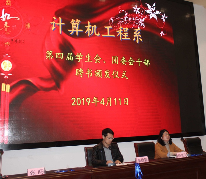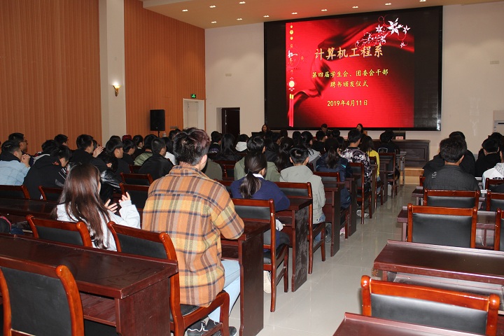 4月11日下午4点,计算机工程系在新农业综合实训楼124举行我系第四届学生会、团委会干部聘书发放仪式。系学生会、团委会全体成员及各班学生代表参加了本次活动,计算机系副主任朱殷勤、学管主任柏雪飞、学管老师张旸、潘凤出席了仪式。