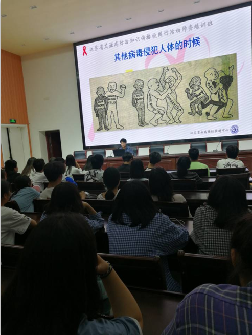 胡嘉玮同学曾于今年四月代表我校参加淮安市艾滋病防治同伴教育培训。讲座中,他主要从艾滋病的界定、传播途径、流行与危害、预防和控制等四方面进行详细的介绍。之后,费新宇老师号召大家积极参与到预防艾滋病的宣传活动中来,让更多的人了解艾滋病的危害,提高自我保护意识。