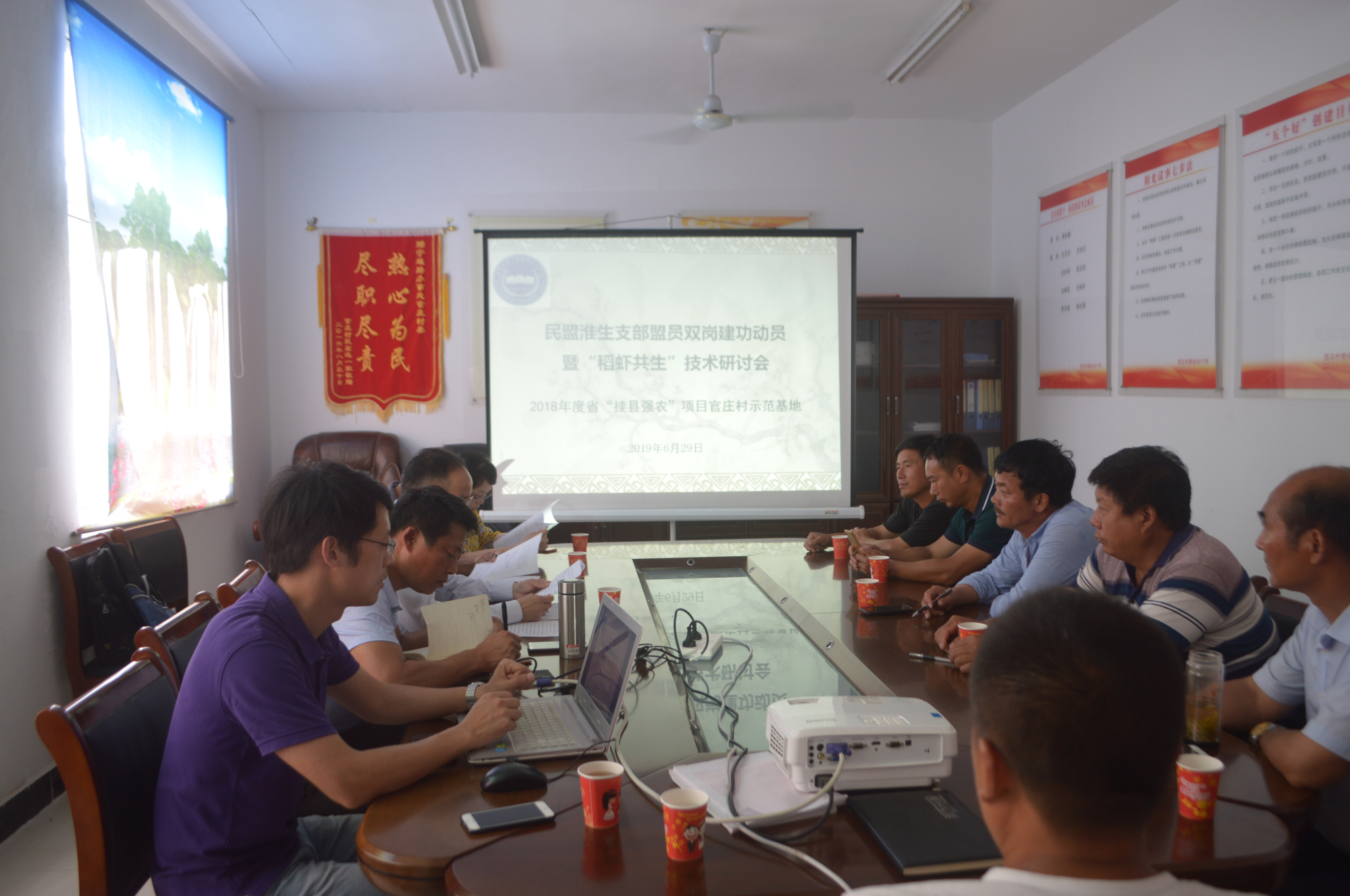 为贯彻落实习近平新时代中国特色社会主义思想和中共十九大精神,宏扬民盟的优良传统,6月29日,校民盟支部在2018年省“挂县强农富民”项目官庄示范基地召开双岗建功动员及稻虾共生技术研讨会。会议要求各位盟员、特别是青年盟员,积极投身“弘扬爱国奋斗精神、建功立业新时代”活动中去。