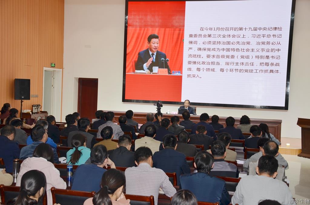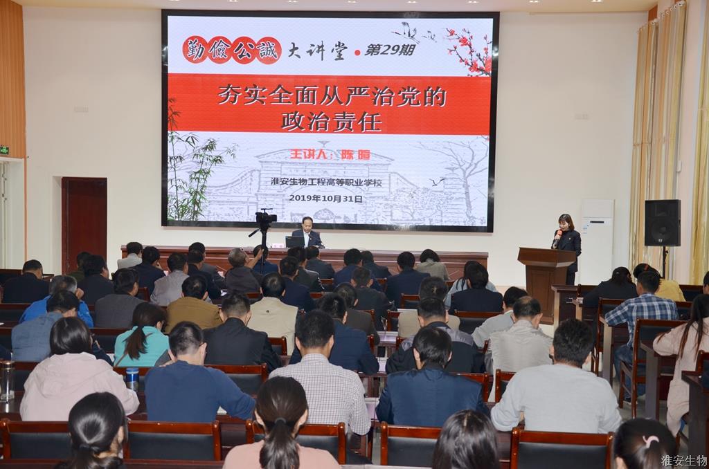 10月31日下午,在新农业实训楼124会议室,淮安市纪委委员、市委机关工委书记陈暄应邀走进第29期勤俭公诚大讲堂,作题为《夯实全面从严治党的政治责任》专题讲座。校领导班子成员、全体中层干部、各党支部委员、党委部门工作人员、党员代表、党员发展对象、入党积极分子、学生代表近130人聆听了讲座。讲座由姚君老师主持。