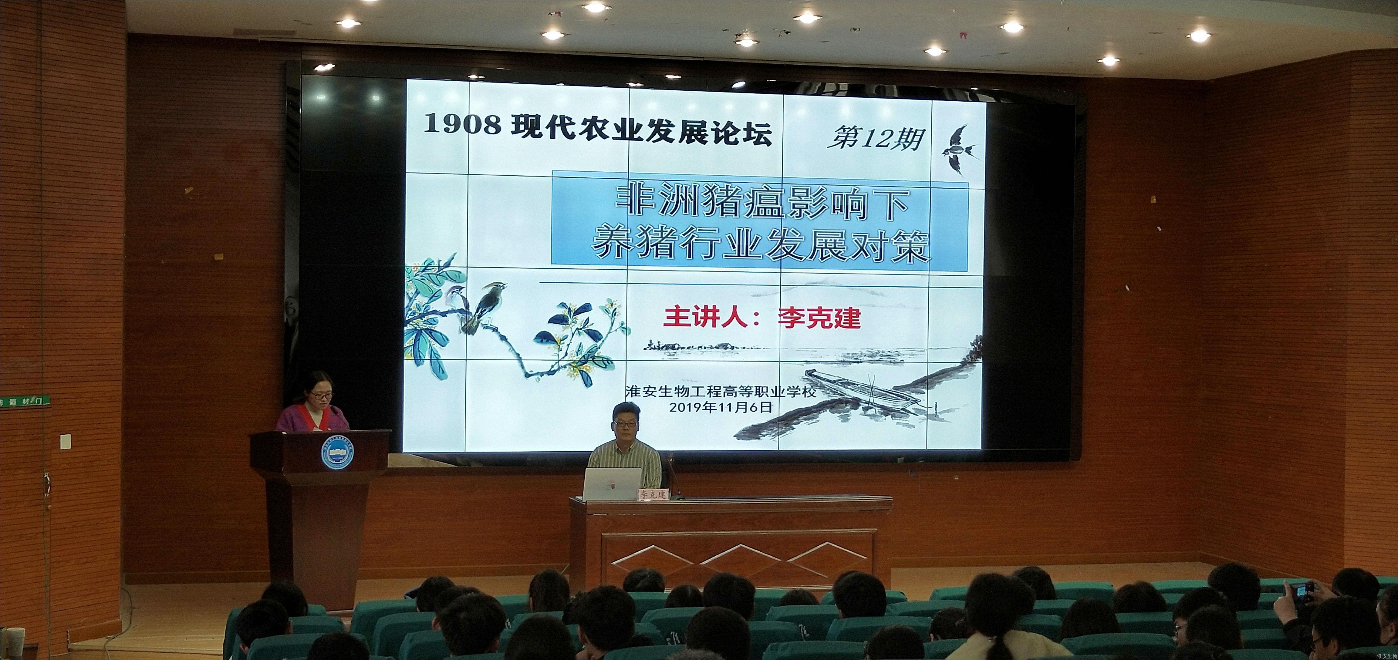 11月6日下午,我校在多功能报告厅举办第12期“1908现代农业发展论坛”。江苏德康农牧科技有限公司副总经理李克建应邀作了题为“非洲猪瘟的现状和防控策略”的专题讲座。副校长李慧、淮台现代农业职业教育集团部分成员单位代表及动物工程系师生代表聆听了讲座。