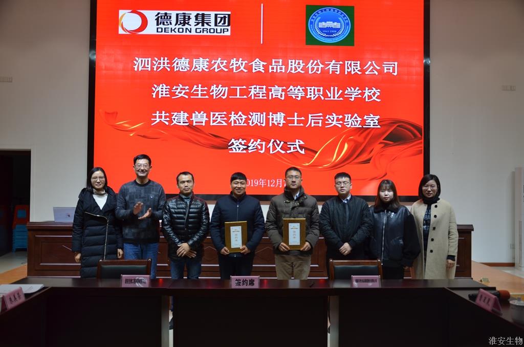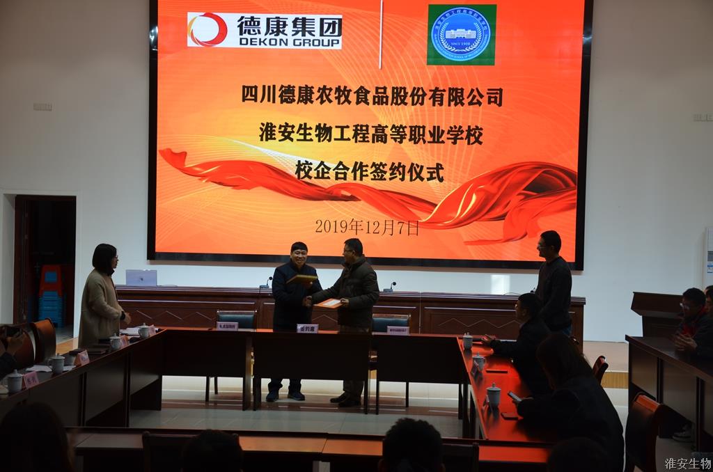 12月7日上午,我校与四川德康农牧食品集团股份有限公司(以下简称德康集团)举行校企合作签约仪式。德康集团生猪事业部华东片区技术总监杨龙圣、德康集团生猪事业部华东片区人事总监兼泗洪德康副总经理曹星晨、德康集团生猪事业部泗洪德康人事专员谭文艺、副校长赵守东、校企合作处负责人、动物工程系负责人及师生代表参加了签约仪式。仪式由校企合作处副处长朱美荣主持。